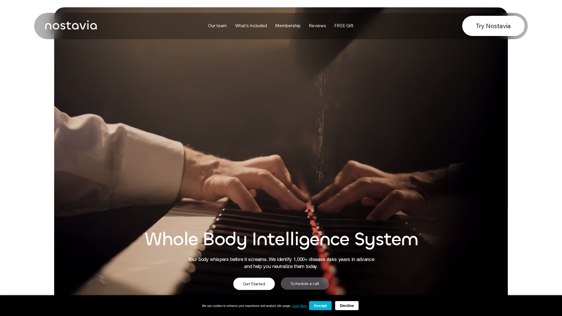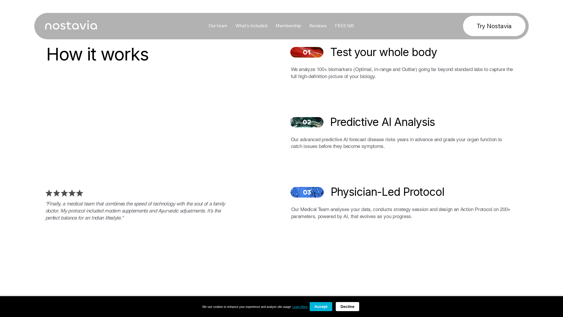 Nostavia Health offers a comprehensive Longevity Program (Nostavia Longevity Report) with 100+ biomarkers across ~11 health domains and 17+ AI scores, organ-function grading, and disease-risk forecasting using a PhenoAge-inspired biological age approach. The program features a physician-designed protocol addressing 200+ parameters, specialty programs (Radiance, Follica, Shape), Digital Clinics/Telehealth with registered practitioners, and Nostavia Intelligence — an AI health companion that links results and doctor notes to provide personalized answers and daily action plans (Daily AI Dynamic Rhythm of 7–10 daily actions). The care model includes a dedicated private medical team, a nutritionist, unlimited text access, Deep-Dive Strategy Sessions (~45 minutes), weekly/monthly follow-ups, daily morning sessions, and advanced tracking. Testing supports home phlebotomy or in-lab collection via 200+ labs across 220+ cities. A curated Marketplace connects third-party products via Nostavia as facilitator (per Terms). Pricing includes promotional one-time options and free tools, with a membership portal and family discounts.
