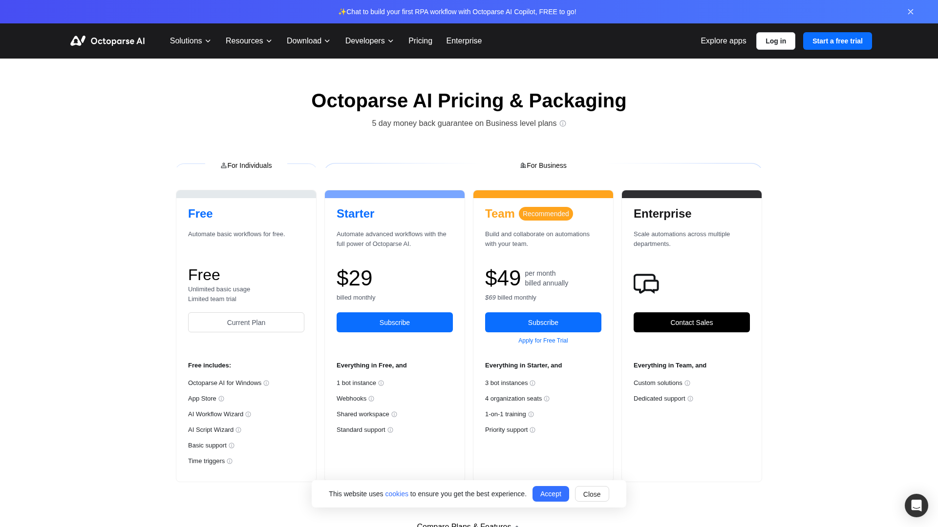 Free plan: unlimited basic usage, Octoparse AI for Windows, App Store access, AI Workflow Wizard & AI Script Wizard, basic support, time triggers.