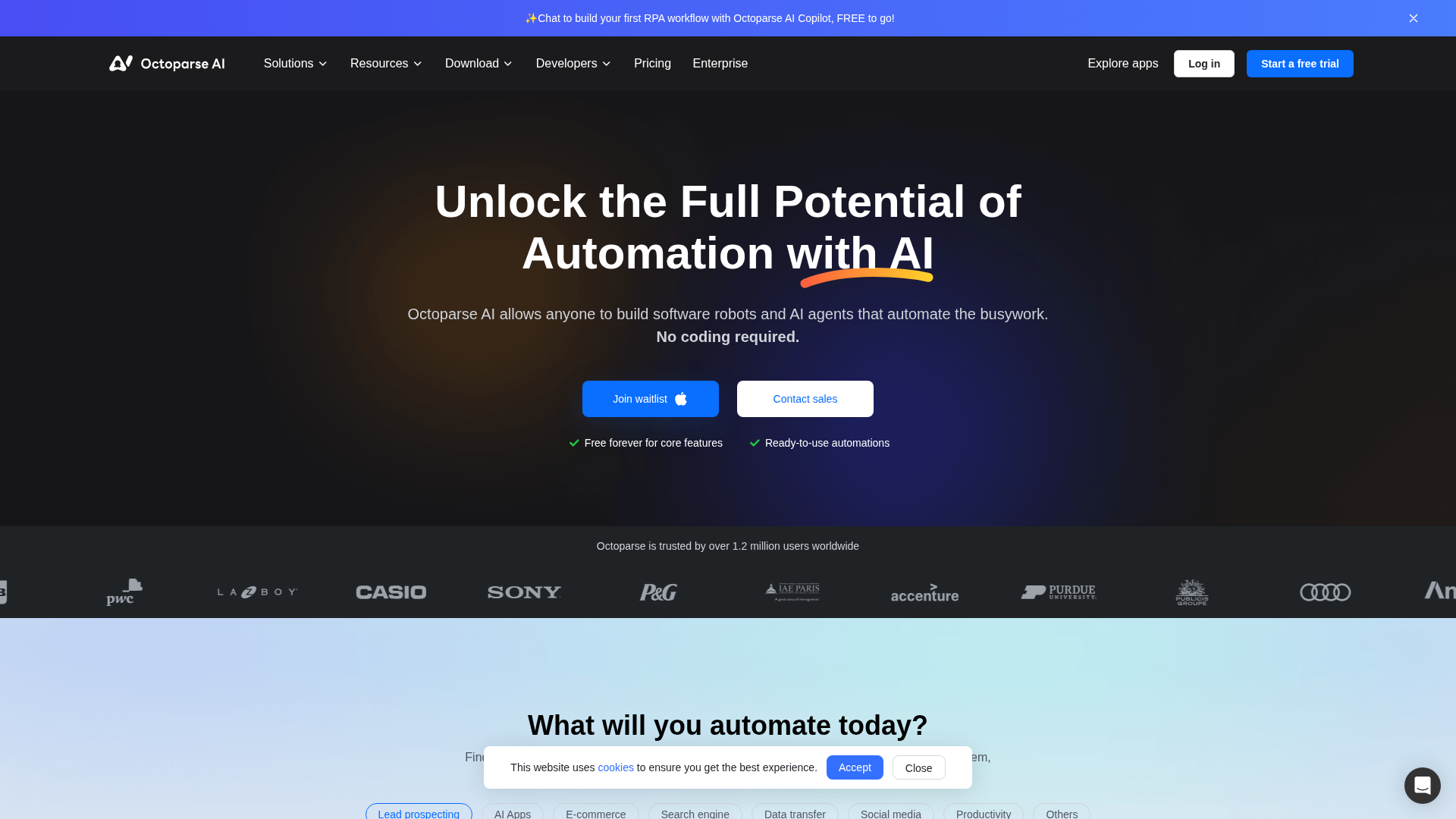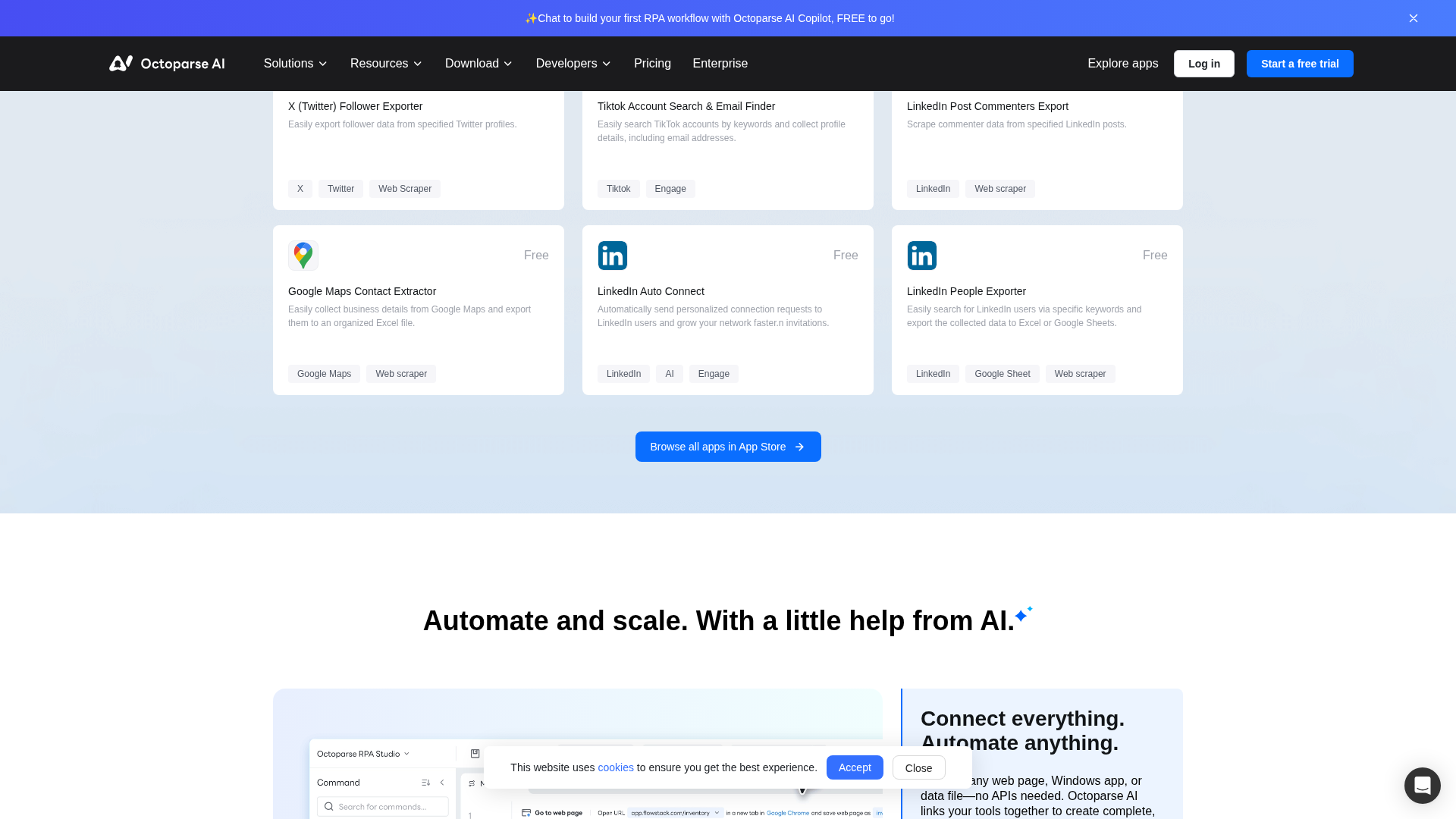 Octoparse AI is presented as a no-code RPA and AI automation platform focused on Windows desktop clients, offering an App Store of prebuilt automations. Key capabilities called out on the site include an AI Copilot conversational assistant for building workflows, drag-and-drop workflow authoring (with optional code steps), OCR, CAPTCHA solving, web scraping, desktop (Windows) automation, webhooks and file connectors, and LLM-driven commands/workflows. The platform is positioned for SMBs and citizen automators while supporting team and enterprise use. Pricing is freemium with subscription tiers and multiple usage-based add-ons/credits for AI features (workflow runs, tokens, OCR pages, CAPTCHA solves). The site also highlights a developer/partner App Store program where developers can publish and monetize automations (cited revenue share of 70%+). Platform constraints and important purchase considerations on the site include a Windows client requirement, usage-based AI features that require prepaid credits, and Enterprise plans that require contacting sales for custom pricing and configuration.