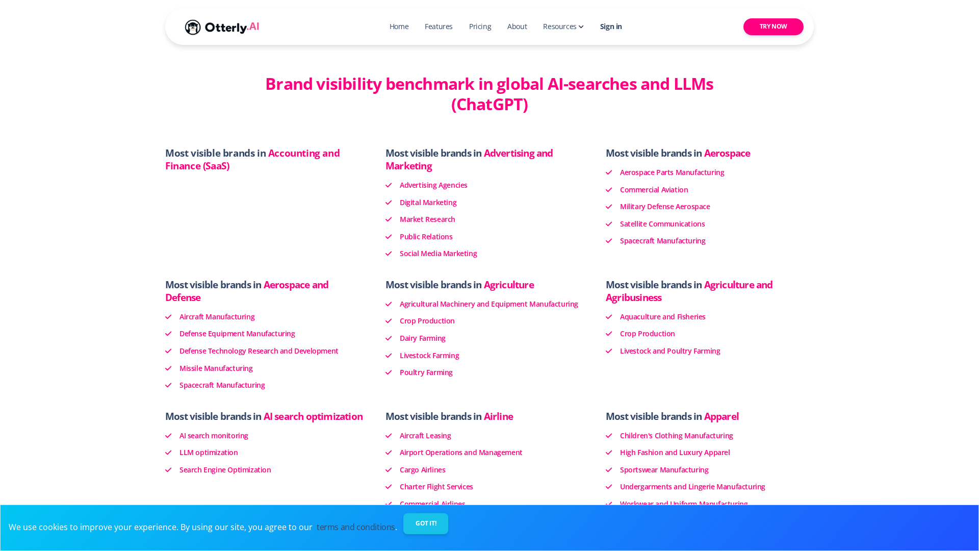 OtterlyAI provides brand visibility benchmarking across AI-powered searches (ChatGPT, Google AI Overviews) to help dominate your industry.
