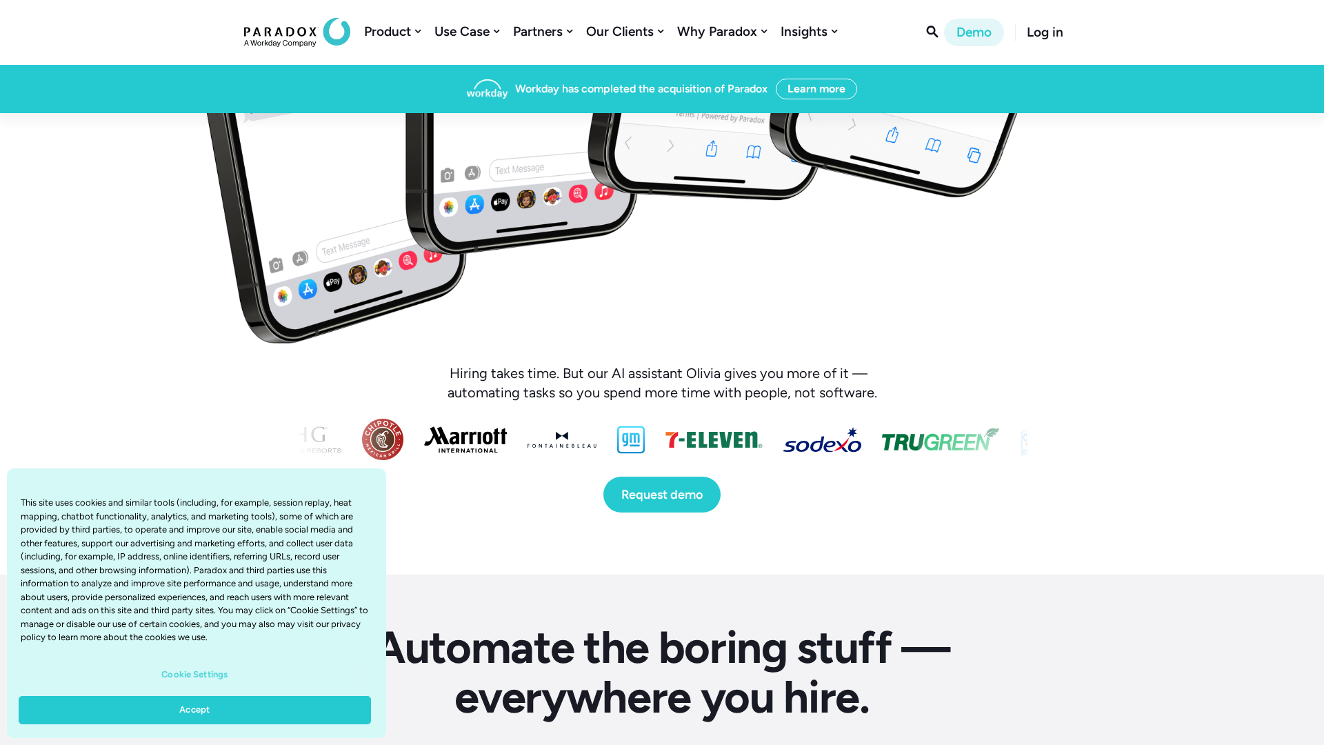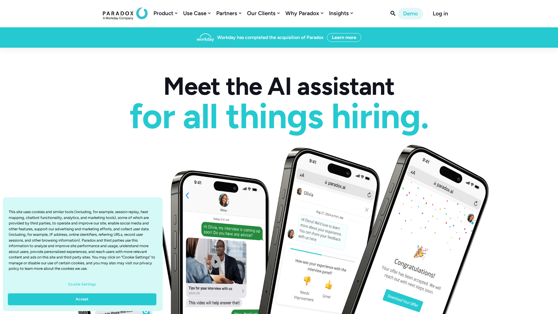 - ✓Mobile-first conversational channels (SMS, WhatsApp, Messenger, Paradox app) for candidate engagement.