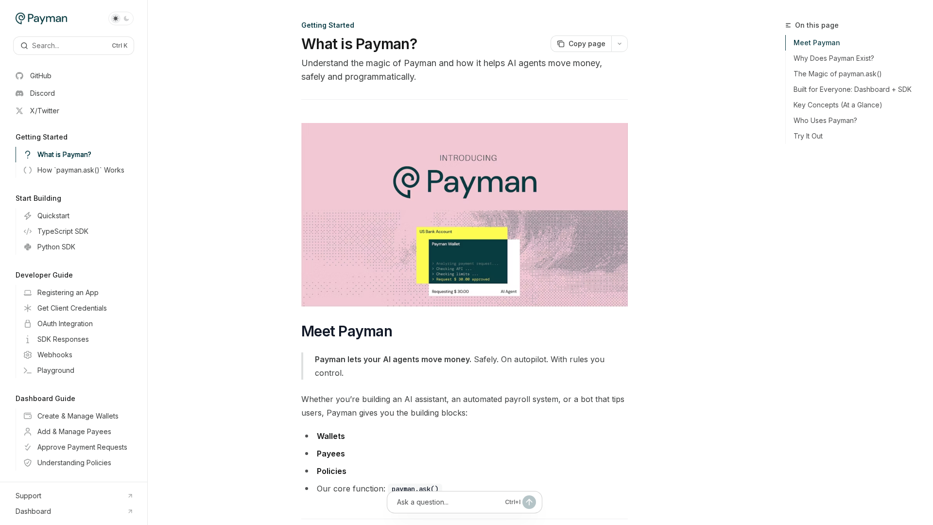 - Developers:Build apps that integrate payman.ask(), manage wallets/policies, and deploy agents using SDKs and APIs.