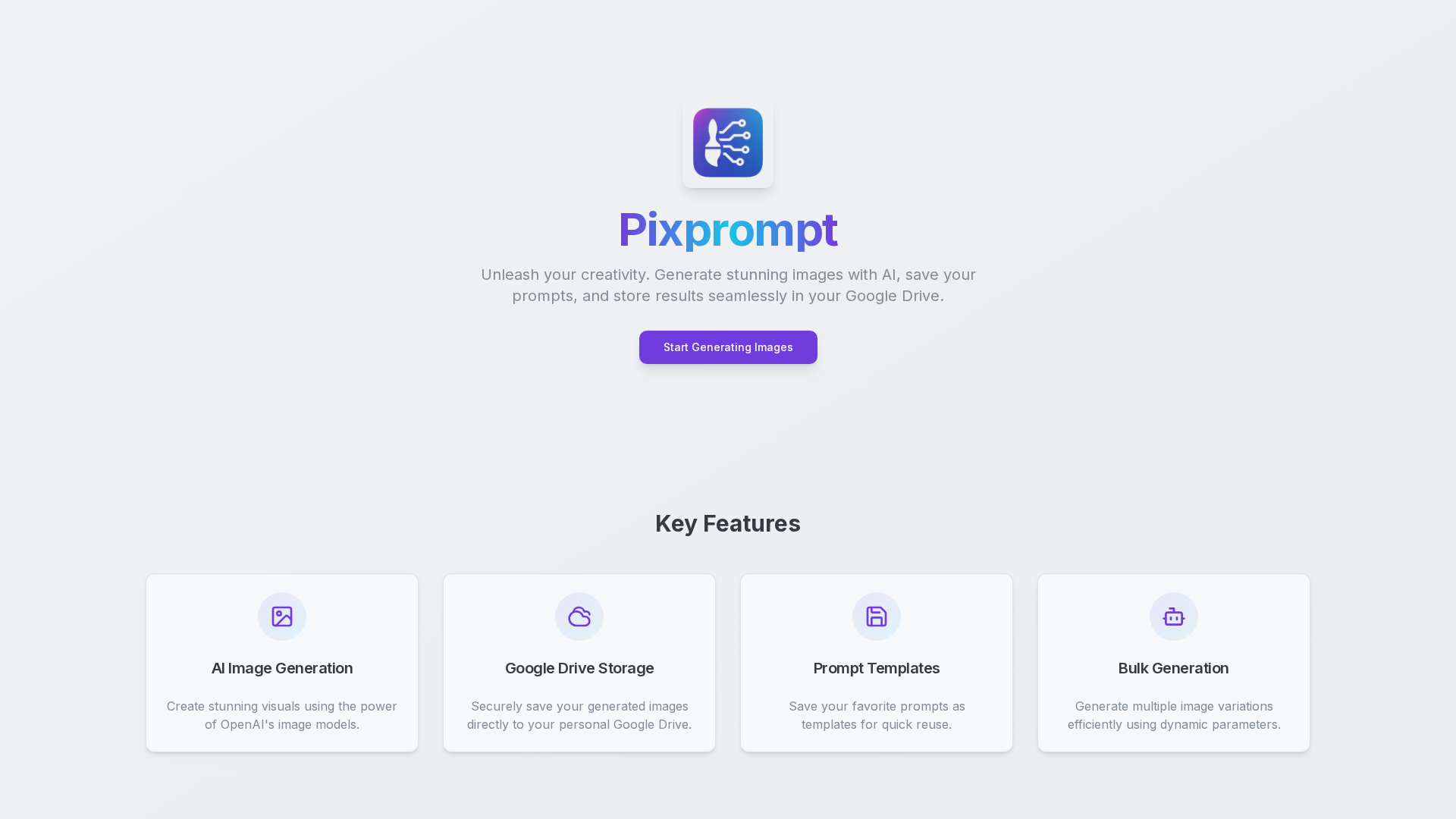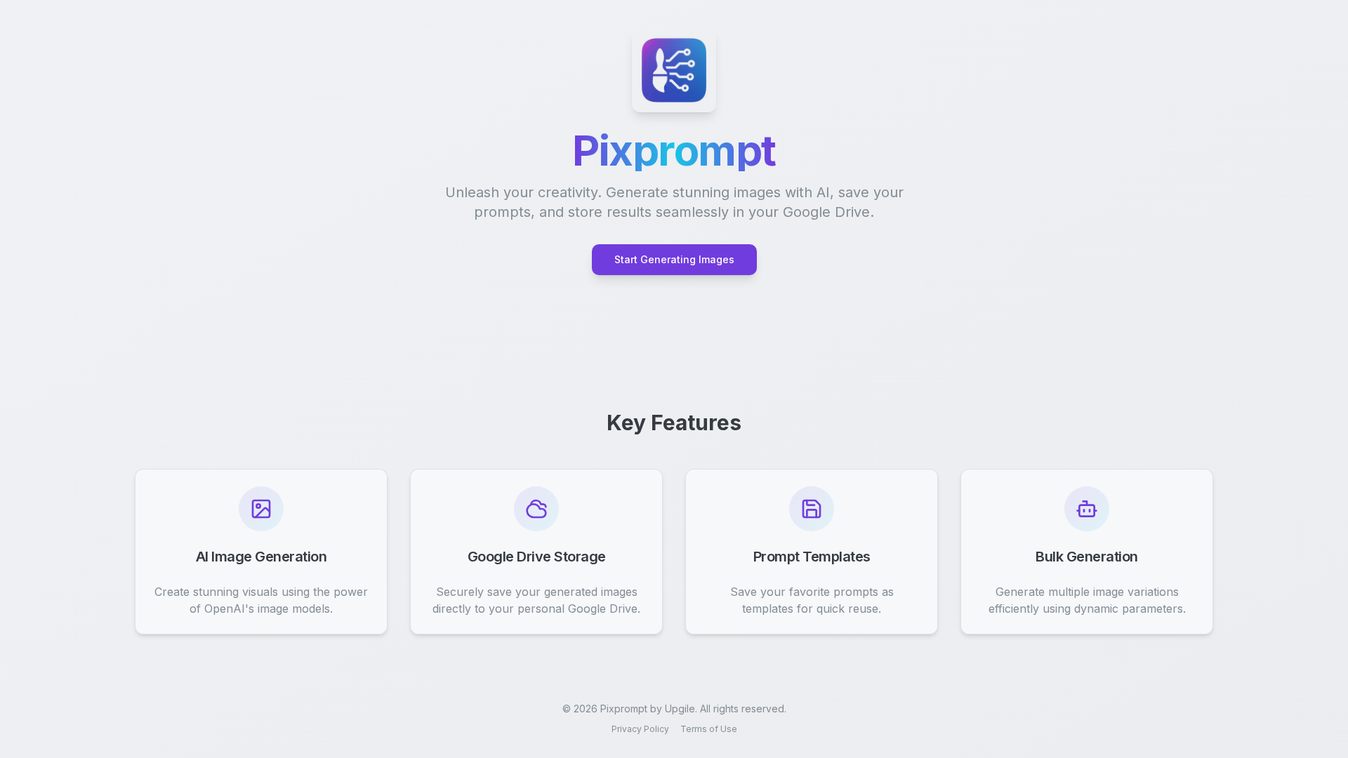 Collected site metadata and links indicate Pixprompt by Upgile is a web-based tool for prompt engineering and AI image generation. The home page base URL is https://pixprompt.upgile.fr/ (also seen with a ?ref=producthunt), with a favicon at https://pixprompt.upgile.fr/favicon.ico and a site tagline describing creativity, generating images with AI, saving prompts, and storing results in Google Drive. The visible footer notes dynamic parameters for generating multiple image variations and a copyright line for 2026. Attempts to fetch content from related pages such as /features, /about, /docs, /pricing were unsuccessful, so official feature lists and pricing remain unverified. An Android app listing on Google Play (PixPrompt: AI Photo Editing, id=com.ghauribros.pixprompt) and an alternate domain (https://pixprompt.in/) as a prompt gallery were observed. The summary infers Pixprompt focuses on dynamic prompts/parameters (resolution, aspect ratio, color palette, model version), generating multiple variations from a single prompt, prompt libraries/templates, and Google Drive integration to store results. Pricing data could not be retrieved; has_free_trial is false, and pricing_plans/models are empty.