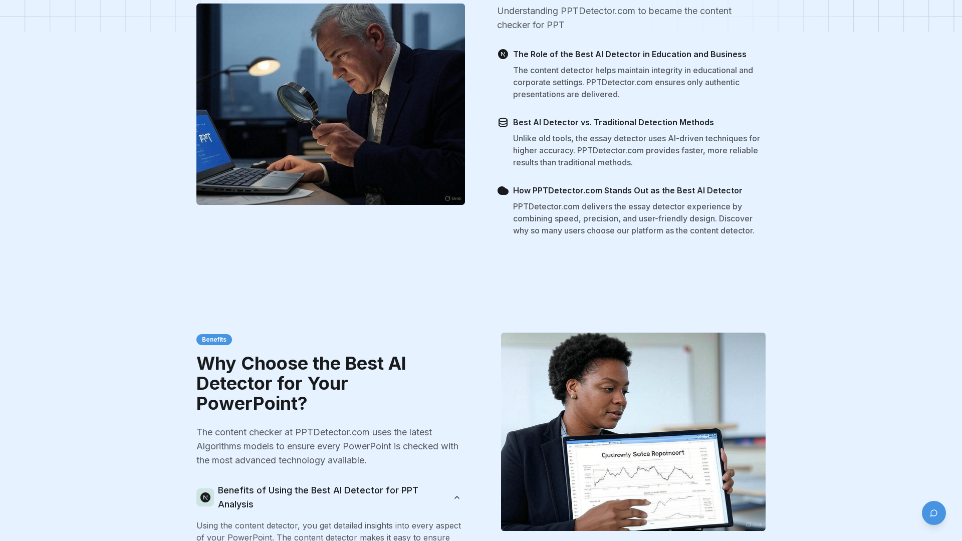 - ✓Detects AI-generated PowerPoint content using multi-layer analysis