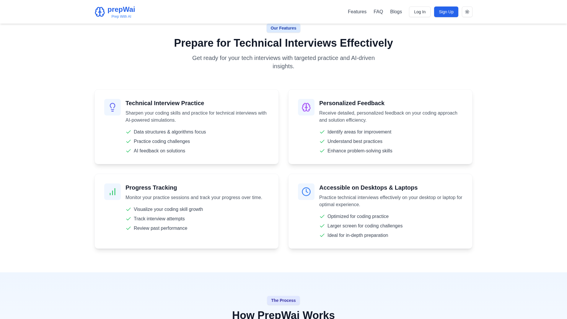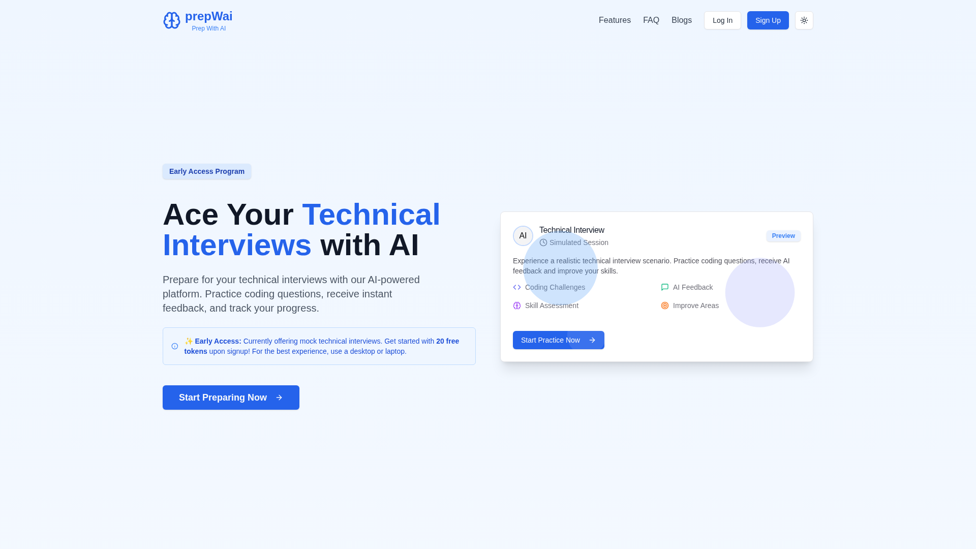 PrepWAI is an AI-powered interview-prep platform focused on technical interviews (data structures & algorithms). It offers realistic mock interviews with an AI interviewer, instant detailed feedback on code, problem approach, and efficiency, and tools for tracking progress and visualizing skill growth. Users can customize interview simulations based on target roles, experience, and job descriptions, and practice question sequences centered on data structures and algorithms. The token-based model provides access to many premium features via tokens; tokens are sold in packs of 10 for ₹10, and are delivered digitally after purchase through the platform's payment gateway. Payments are processed by third-party providers and PrepWAI does not store full payment details. Pricing may be modified with prior notice. Early Access currently provides new users 20 free tokens. Privacy, terms, shipping, and cancellation/refund pages provide policy details (dated March 11, 2025 for privacy terms).