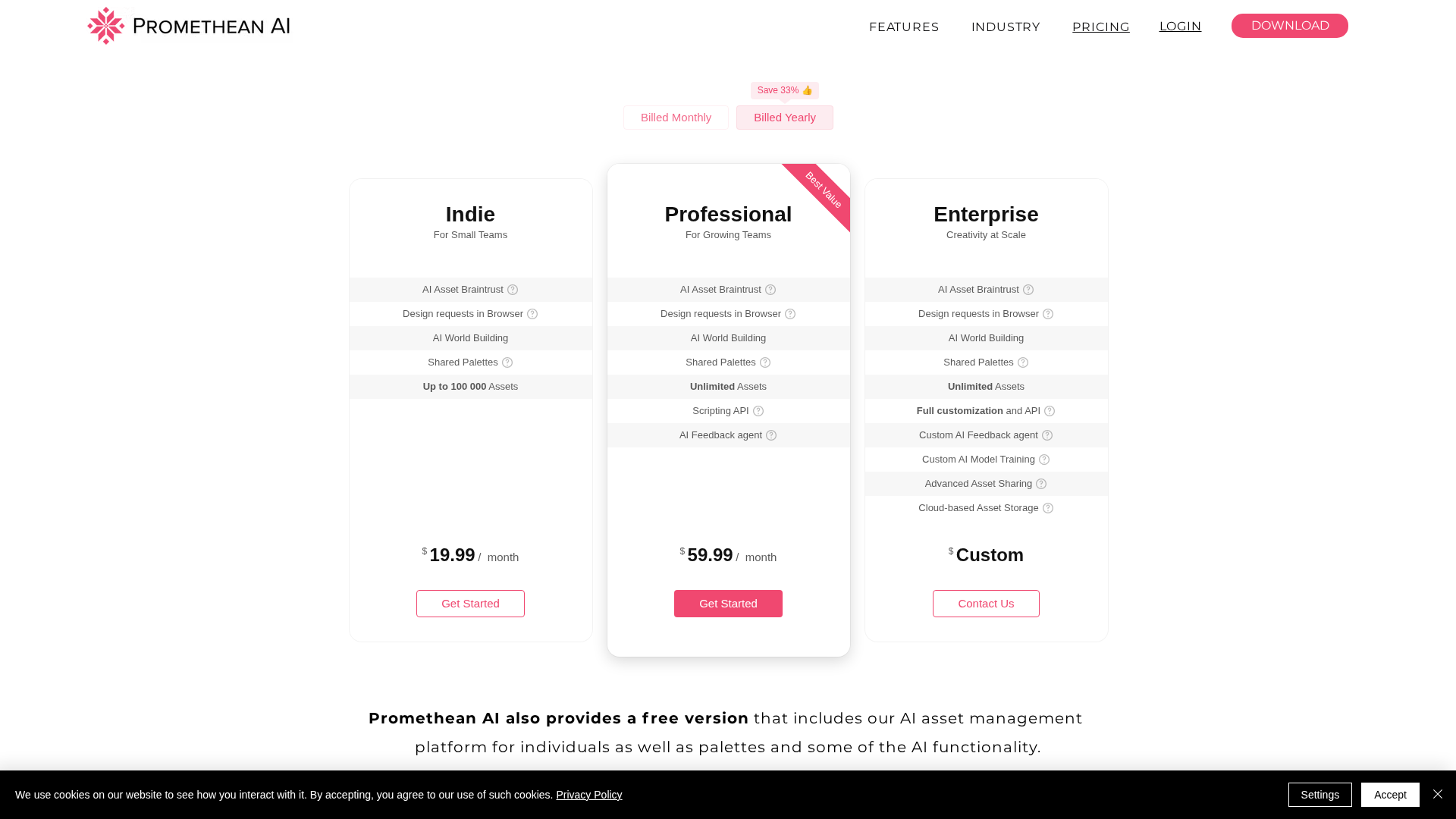Promethean AI is described on its site as an "enterprise braintrust" and creative AI assistant for world‑building and asset management that sits on top of existing pipelines and editors. It indexes and reasons about assets (images, videos, 3D models, animations, PDFs, presentations) via a metadata-driven "Braintrust", and provides an Asset Browser, Palettes, Inspiration mode (browser) and Source File mode (folder sync) to surface references and keep metadata synchronized. The product offers natural-language AI Assistant capabilities to propose combinations and design decisions, command-line asset search in the public build, collaboration boards and shared palettes (syncable via shared folders, MySQL, or S3), and primary integration with Unreal Engine plus open-source plugins for Unity, 3ds Max, Maya and Blender (plugin compatibility may vary by editor/version). Enterprise features listed on the site include Python customization, a short/API integration option, SSO, MFA, account ownership controls, CI/CD deployment support, optional managed storage, and the ability to train custom AI models for specific pipelines. Privacy and data handling guidance on the site emphasizes that assets remain under customer control; the architecture builds a metadata library and the site claims not to upload, store, or train on customers' actual asset files. Sharing of the metadata library can be done via shared folders, databases (MySQL), or S3; an optional managed upload/storage service is offered. The site markets a free public build (downloadable) with limited features compared to enterprise, and lists a Free plan on the pricing page but does not publish paid enterprise pricing or tier breakdowns online—interested parties must contact sales or request a demo. Company/leadership information referenced on the site and collected externally: Founder/CEO Andrew Maximov (former technical art director at Naughty Dog). External sources referenced on/linked from the site list 2018 as the founding/start year. The site references marketing/support claims (e.g., references to 10,000+ users and supporters such as PlayStation Studios / Sony and Disney Accelerator) as promotional claims visible on the site. Key pages referenced: Home, Pricing, Public Download, FAQ, Enterprise features & API, Tutorials, Games & Film, Outsourcing & Asset Production, and License Agreement. The site encourages joining their Discord community (link present in footer/download page) and references social channels (YouTube, LinkedIn, Facebook, Twitter, Instagram). For enterprise purchases the site implies contacting sales or using support/contact forms; the License Agreement page references a support email (exact email present on that page).