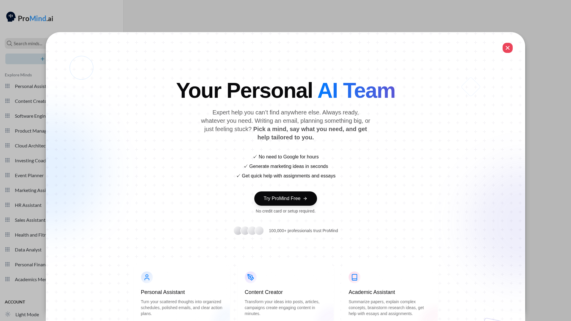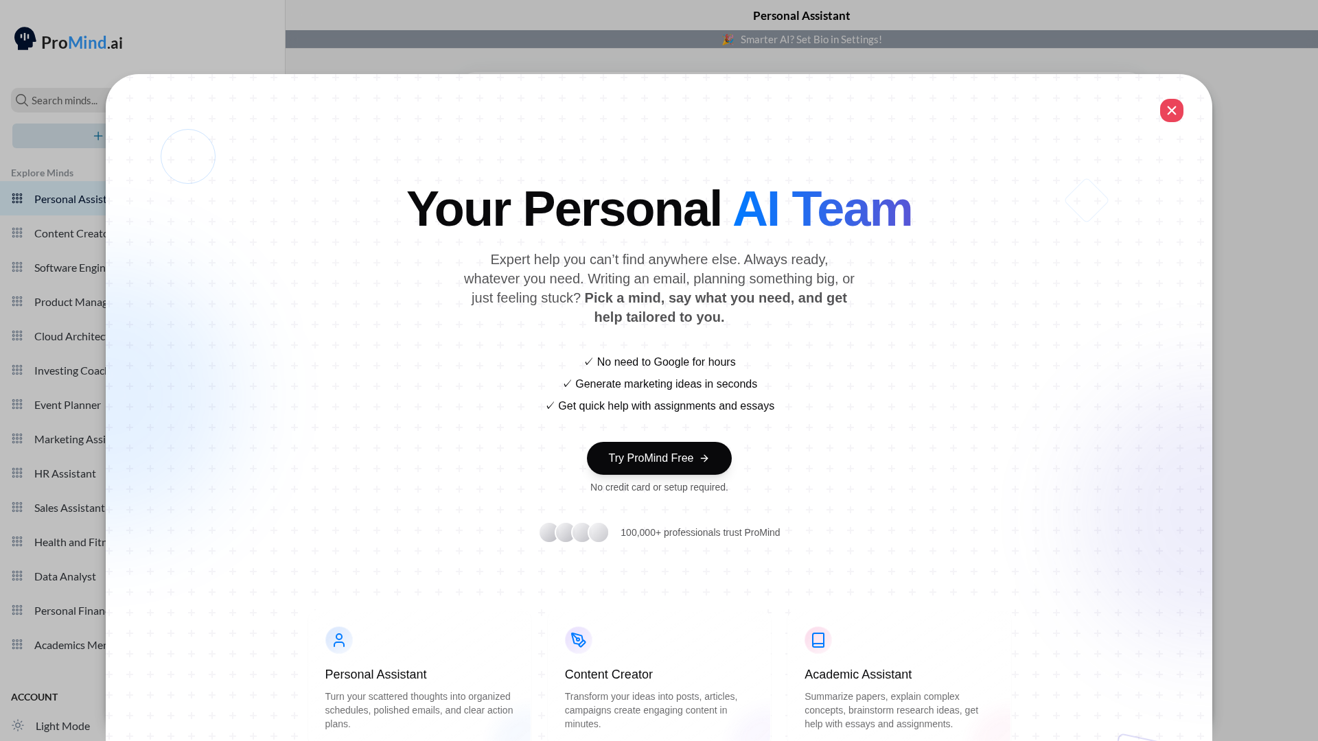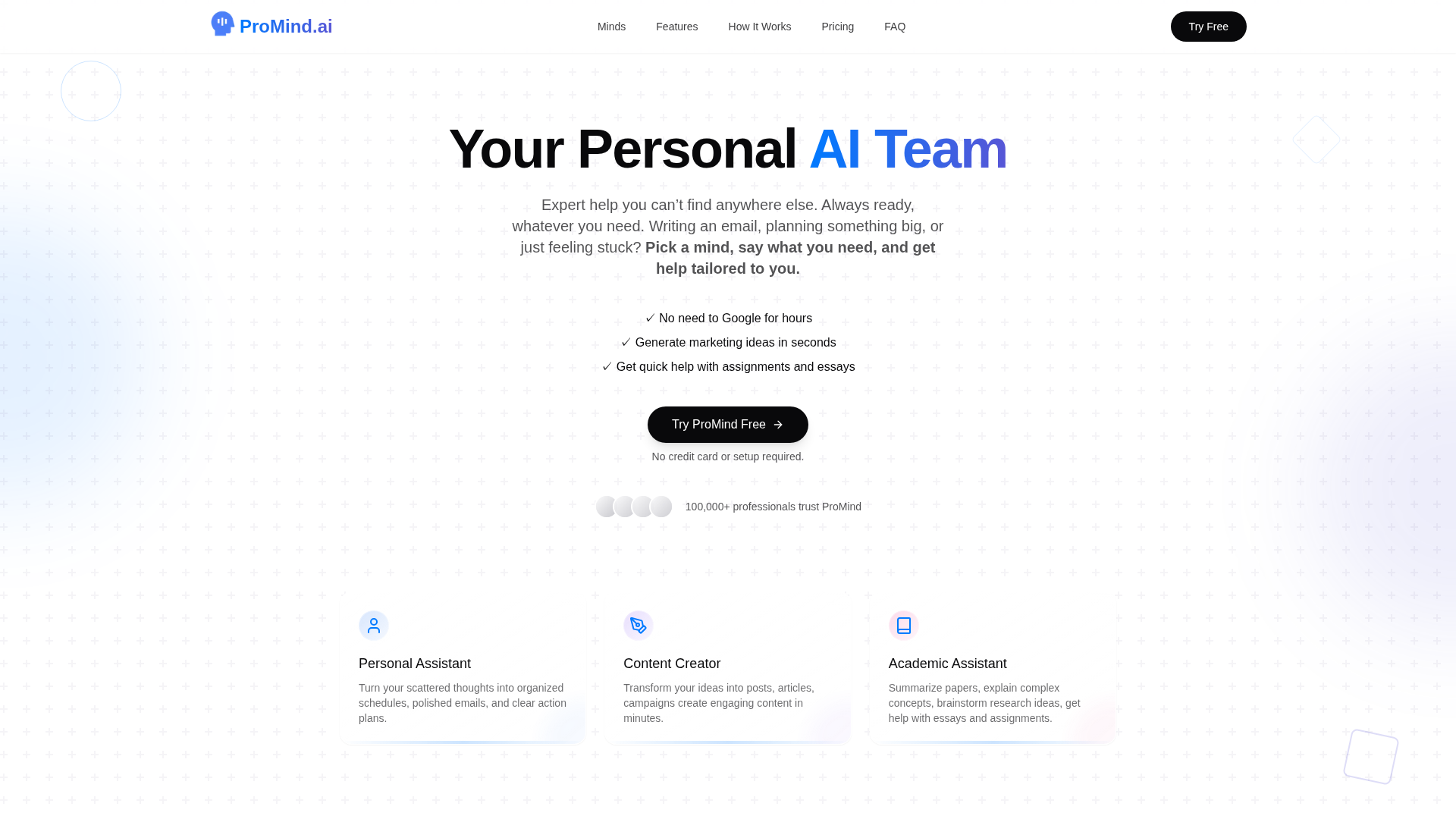 A promo-focused overview of ProMind AI's specialized minds, memory-enabled help, and tiered pricing for personal, content, and academic tasks.