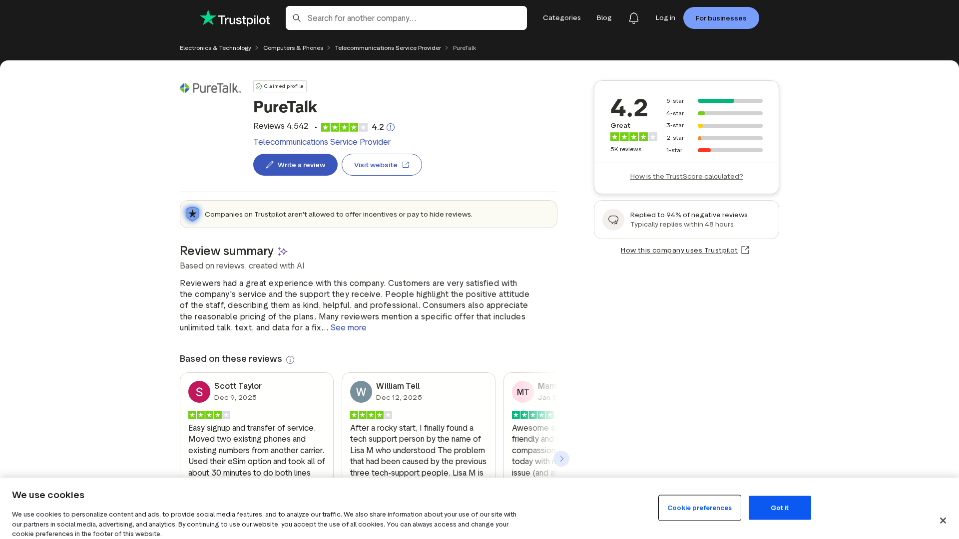 PureTalk holds a 4.2/5 Trustpilot rating with a mix of praise, complaints, and company replies.