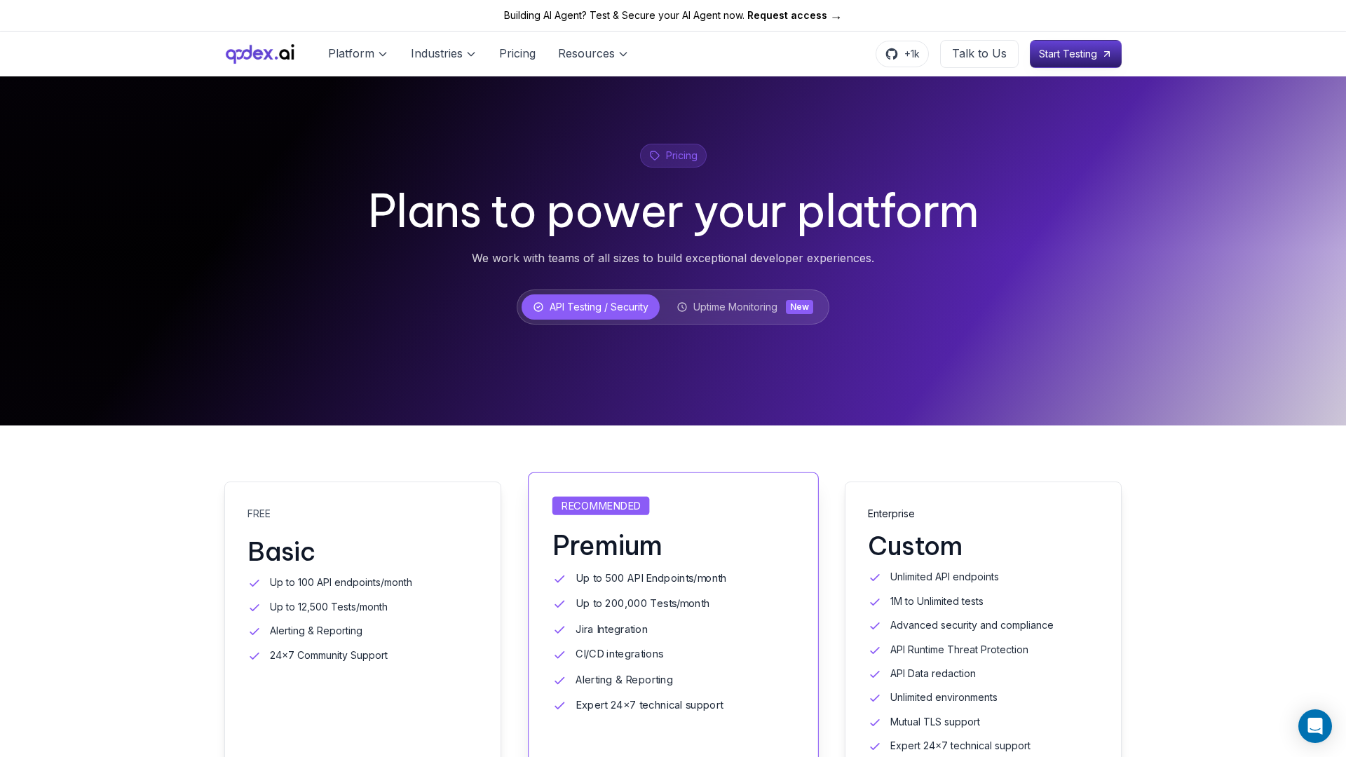Custom pricing, unlimited endpoints, 1M+ to unlimited tests; advanced security/compliance, API runtime threat protection, data redaction, mutual TLS, unlimited environments, expert 24×7 support.