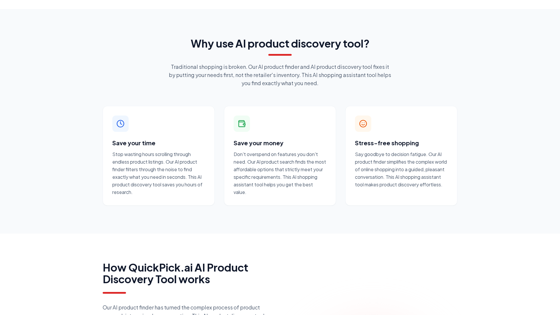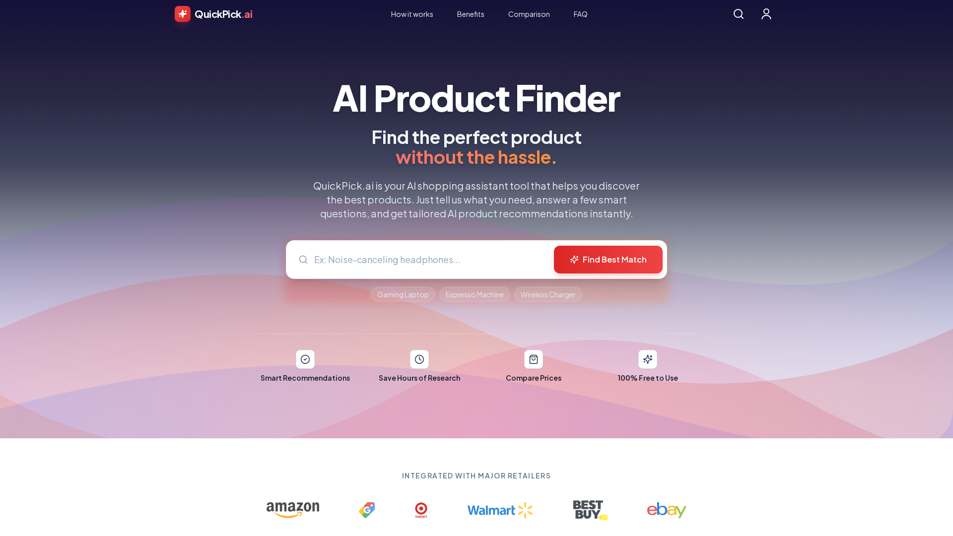 QuickPick.ai is an AI-driven product discovery and shopping assistant that helps shoppers find the right product quickly by asking a few targeted questions and scanning major retailers for prices, specs, and reviews. The service emphasizes reducing decision fatigue by prioritizing user needs rather than retailer inventories and returns concise, personalized recommendations. For businesses, QuickPick.ai offers an API-first e-commerce toolkit that provides personalized recommendations, customer insights and analytics, and advertising/promotion placements to boost conversions and average order value. The platform claims a privacy-forward stance and transparency about recommendation generation and monetization. QuickPick.ai positions itself as a free-to-use consumer product while offering subscription-based tiers and custom enterprise solutions for merchants and advertisers.