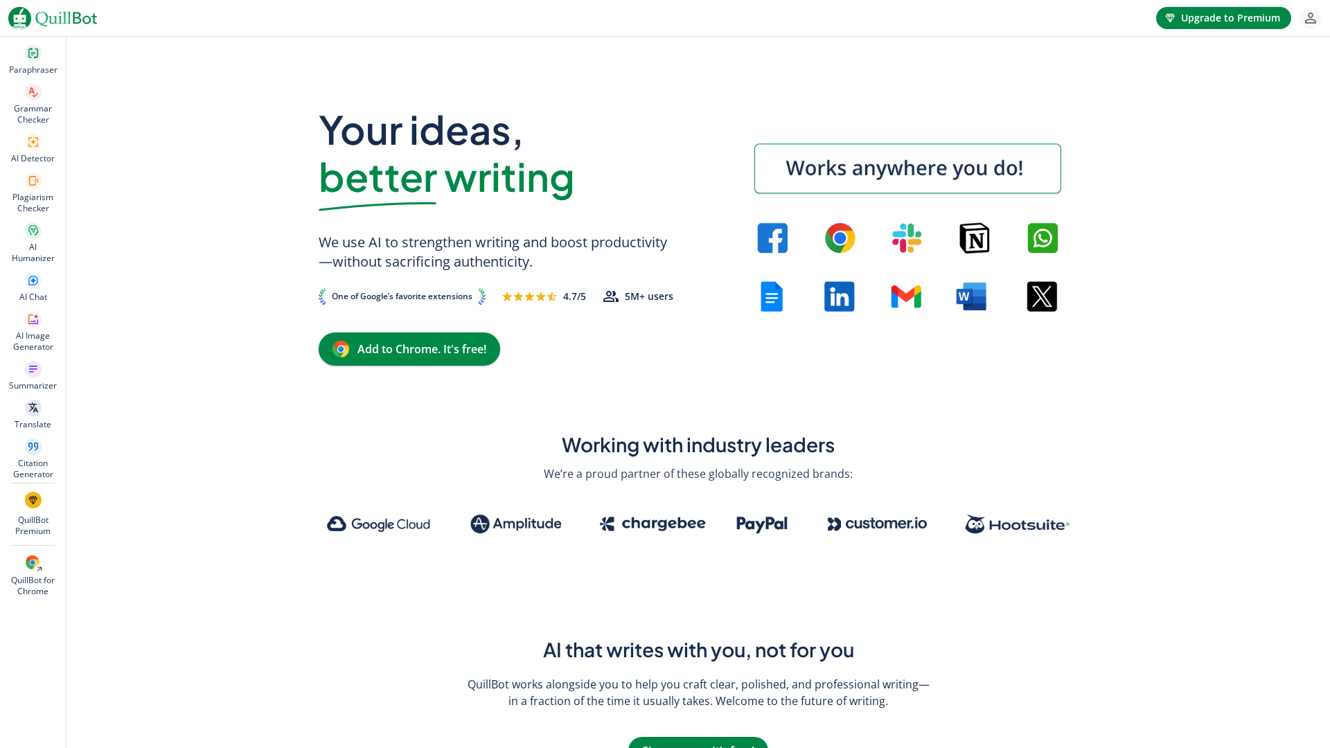 QuillBot is an AI-powered writing suite providing a paraphrasing tool (multiple modes), grammar and punctuation checking, summarization, plagiarism and AI-content detection, citation generation, translation, AI writing utilities, image/document tools, and document organization (QuillBot Flow). It is available via web, browser extensions, desktop and mobile apps, and integrates with Microsoft Word and other platforms. Core audiences include students, professionals, content creators and teams. The product offers a freemium model with restricted capabilities on the free tier and a Premium subscription that unlocks unlimited paraphrasing, all paraphrase modes, expanded translation/language support, advanced grammar recommendations, unlimited AI detector usage, Flow document storage, faster processing and multi-device usage; team plans add centralized billing and user management. Pricing and refund/guarantee terms may vary by region and should be verified at checkout or in the Help Center.