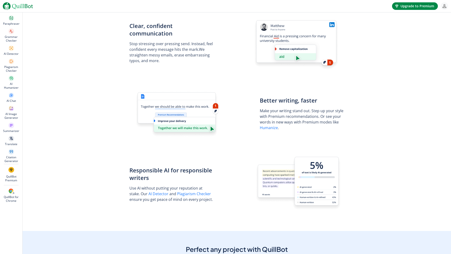 - ✓Comprehensive suite of writing tools in one product (paraphrase, grammar, summarizer, citation, plagiarism/AI detection).