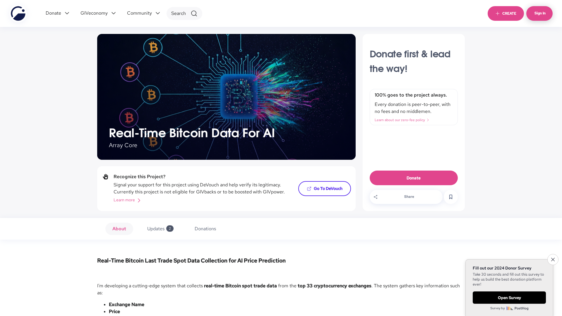 Real (Real-Time Bitcoin Data for AI) is a donation-driven project hosted on Giveth that aims to provide live, AI-ready Bitcoin market data streams for researchers, developers, and the broader crypto/AI community. The project emphasizes a fully transparent funding model: 100% of contributions go directly to the project with a stated zero-fee policy and no intermediary deductions. Real positions itself as an infrastructure resource for model training, backtesting, real-time analytics, and other AI workloads that require low-latency, high-quality Bitcoin data. The page highlights community-driven trust mechanisms (e.g., DeVouch) rather than centralized guarantees; it also cautions users that Giveth does not verify social links provided by projects. The project is framed primarily as a funding/operational pitch focused on transparency and peer-to-peer support rather than a detailed technical product spec.