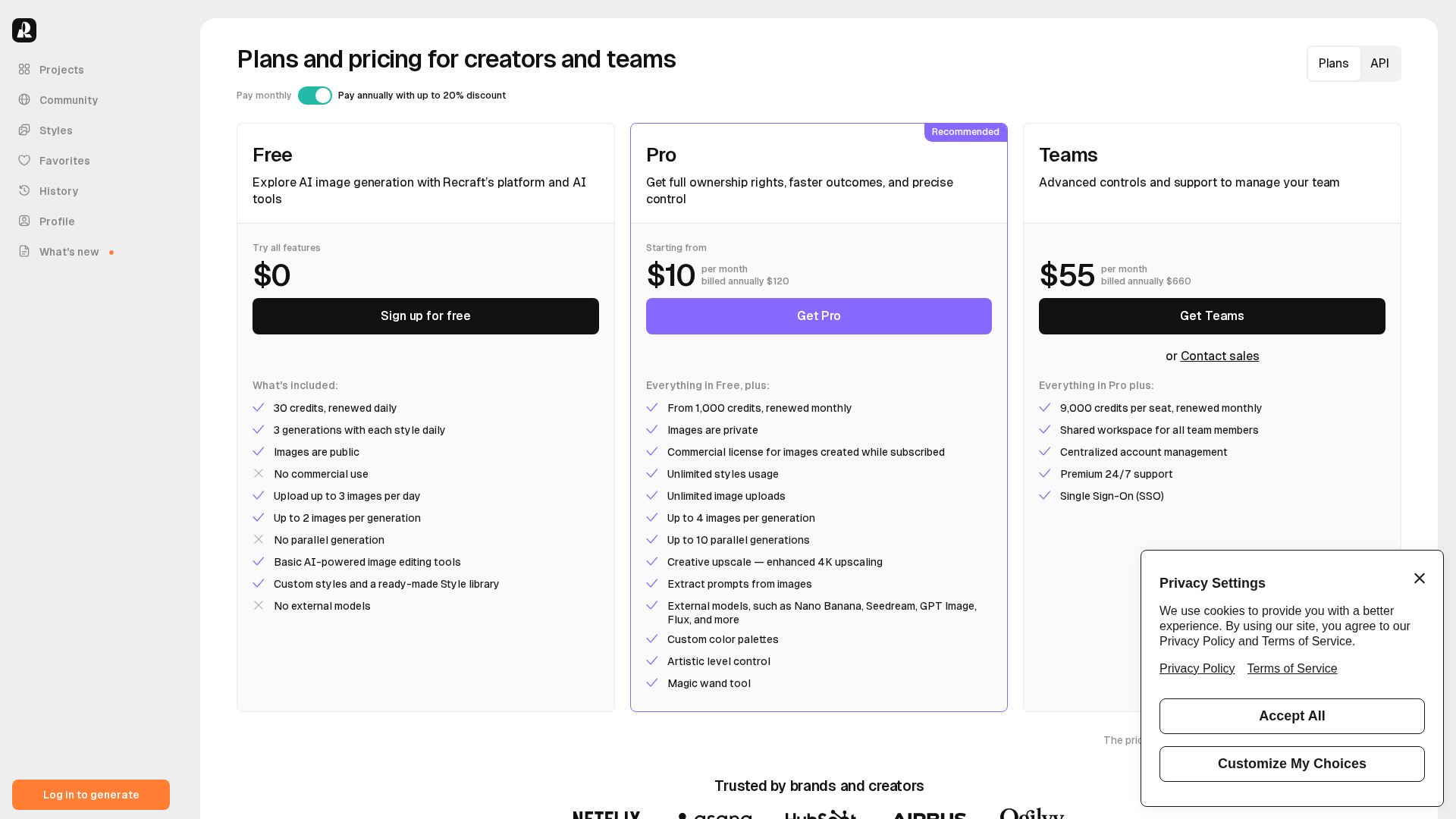 Recraft is an AI-first design platform built for professional designers, illustrators, marketers, and teams. It provides high-fidelity raster image generation alongside native vector generation and precise text rendering, enabling production-ready visuals suitable for branding, ads, logos, and mockups. Users work in Recraft Studio (an interactive design workspace) or via the API, leveraging a style library and custom styles to maintain brand consistency across assets. The platform emphasizes layout control, accurate typography inside generated images, and a workflow that mirrors traditional design tools (layers, frames, comments) while adding AI-assisted generation, editing and vectorization features for fast iteration and scale. Recraft positions itself as a studio-ready tool that supports both individual creators and team/enterprise collaboration.