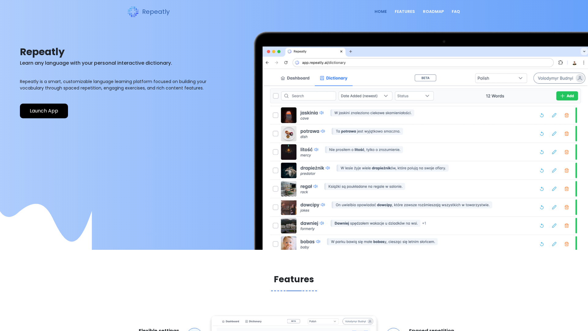 Repeatly is a customizable vocabulary-focused language-learning app offering spaced repetition, AI-generated examples, and user-driven content management.
