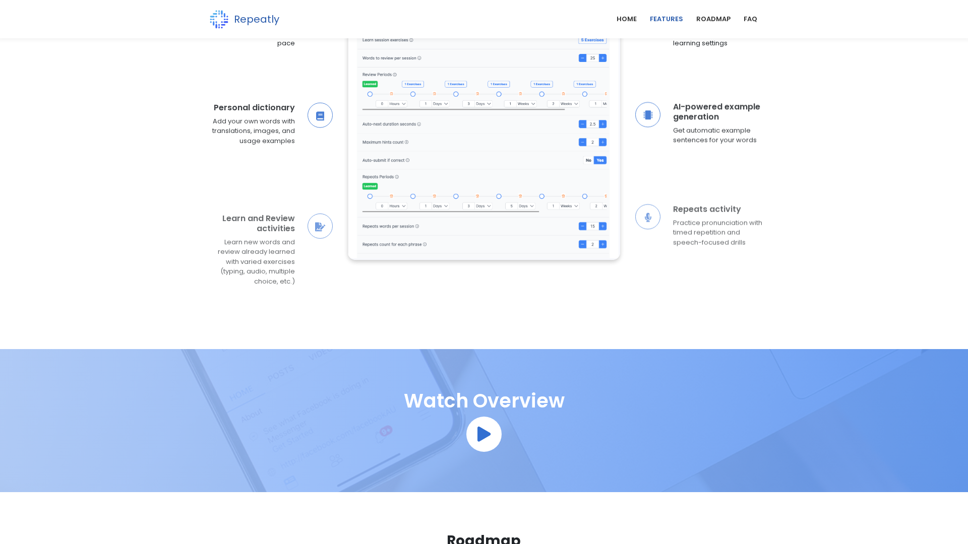 Repeatly is a free beta AI-powered vocabulary builder focused on customizable spaced repetition, varied exercise types, AI-generated example sentences, pronunciation practice, and user-controlled content (users add their own words, translations, and examples). It aims to complement courses and tutors, emphasizing control over personal word lists and scheduling.\n\nCore features include adding custom words with translations, images, and usage examples; spaced repetition scheduling with customizable intervals; multiple exercise types such as typing, audio, multiple choice, and timed pronunciation drills; AI-generated example sentences; pronunciation practice; word batching and scheduling to build a personal dictionary and track reviews; and planned improvements like folders/collections in the roadmap, plus support for any language since translations are user-defined.\n\nNote: Some policy pages show formatting glitches; no explicit data retention details are provided here; verify Terms & Privacy with Repeatly for precise legal text.
