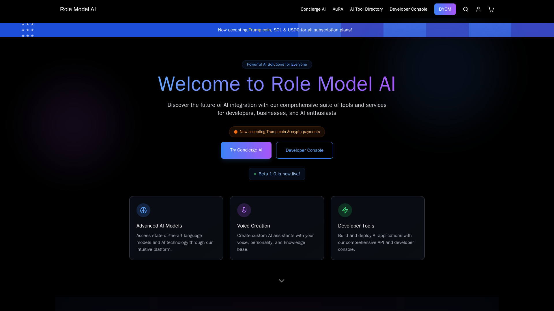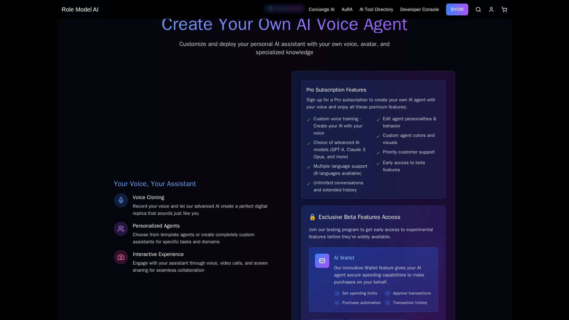 Role Model AI is a combined public directory and product platform focused on voice-first AI assistants and language-model tools. The public side provides a catalog and comparison/filtering features for voice assistants and related tools. The product side (branded Concierge / AuRA in places) enables creation and deployment of custom voice agents including custom voice training, voice avatars, camera/screen sharing, multi-model support, BYOM (bring-your-own-model) and API/developer console access. The Concierge offering is currently presented as a beta with early-access programs, multi-language support (≈8 languages referenced), wallet and social sign-in integrations (Solana/Phantom Wallet, Twitch, X), conversation history and tiered history limits, and unlimited conversations for paid tiers. Pricing information on the site is inconsistently presented in snippets across pages: a free/get-started tier is referenced, Pro is referenced (site snippets suggest ≈ $10/mo but pages are inconsistent), Expert is referenced with a $99/mo snippet, and Enterprise is listed as custom/contact. The site includes help documentation for metadata/content guidance and a status page for operational component reporting. Note: the collected information is based on publicly visible site snippets and Concierge pages; pricing and some feature details showed inconsistency or abbreviated snippets and should be verified on the live site or via direct contact for final accuracy.