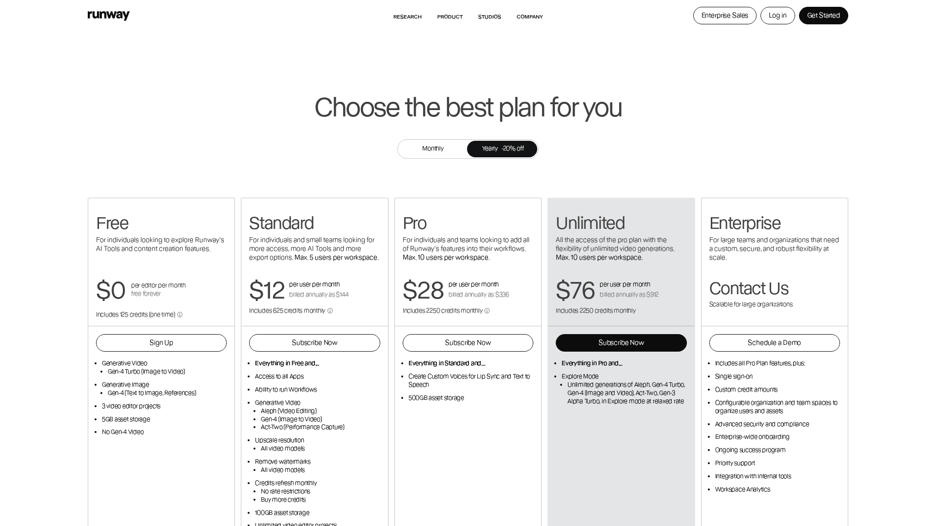 - ✓Limited tool access (no Gen-4 Video access on Free)