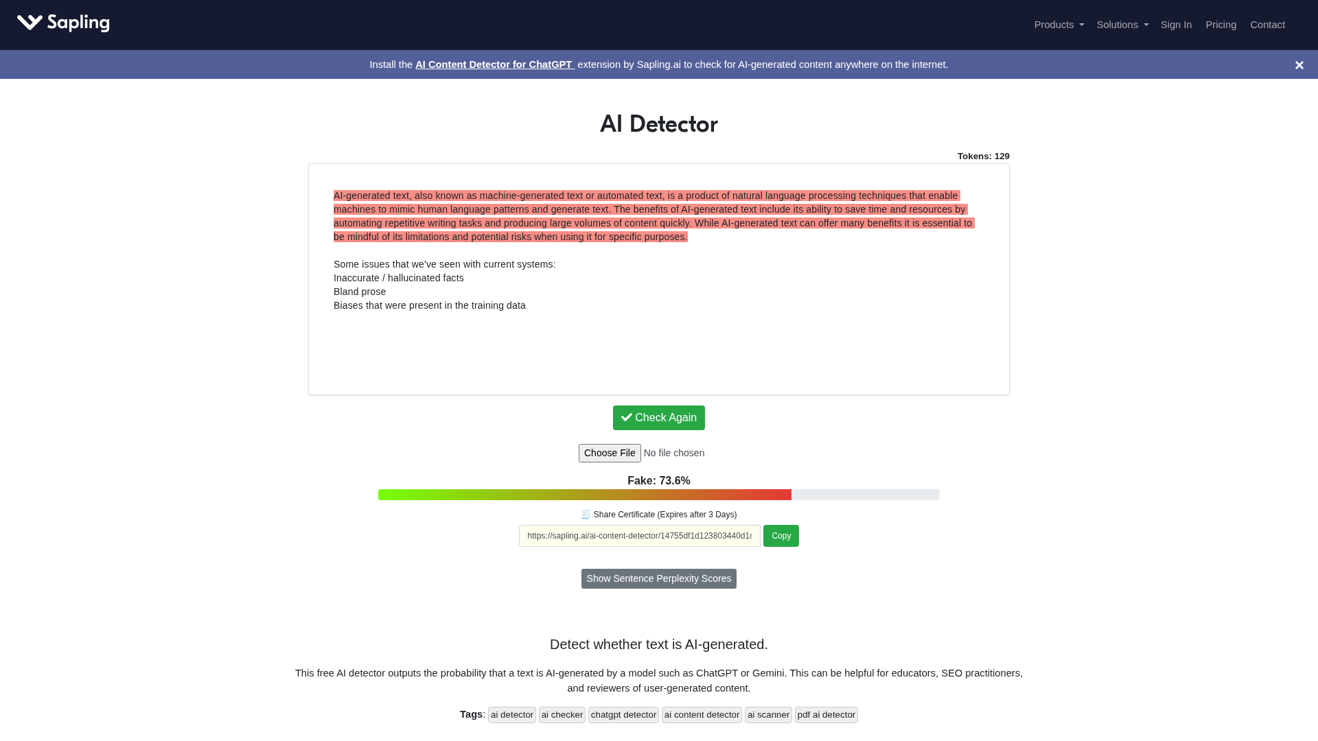 Sapling’s AI Content Detector analyzes text for AI-generated content with per-text and per-sentence scoring and up-to-date model support.