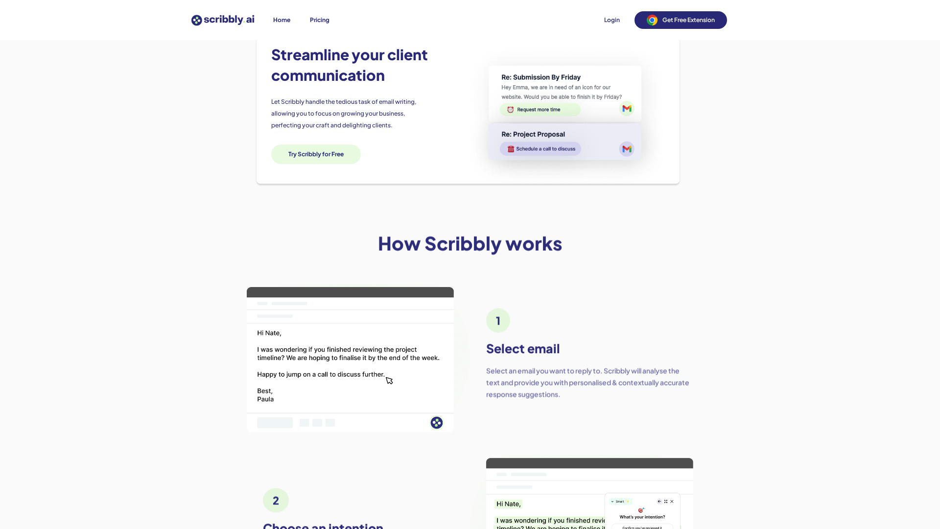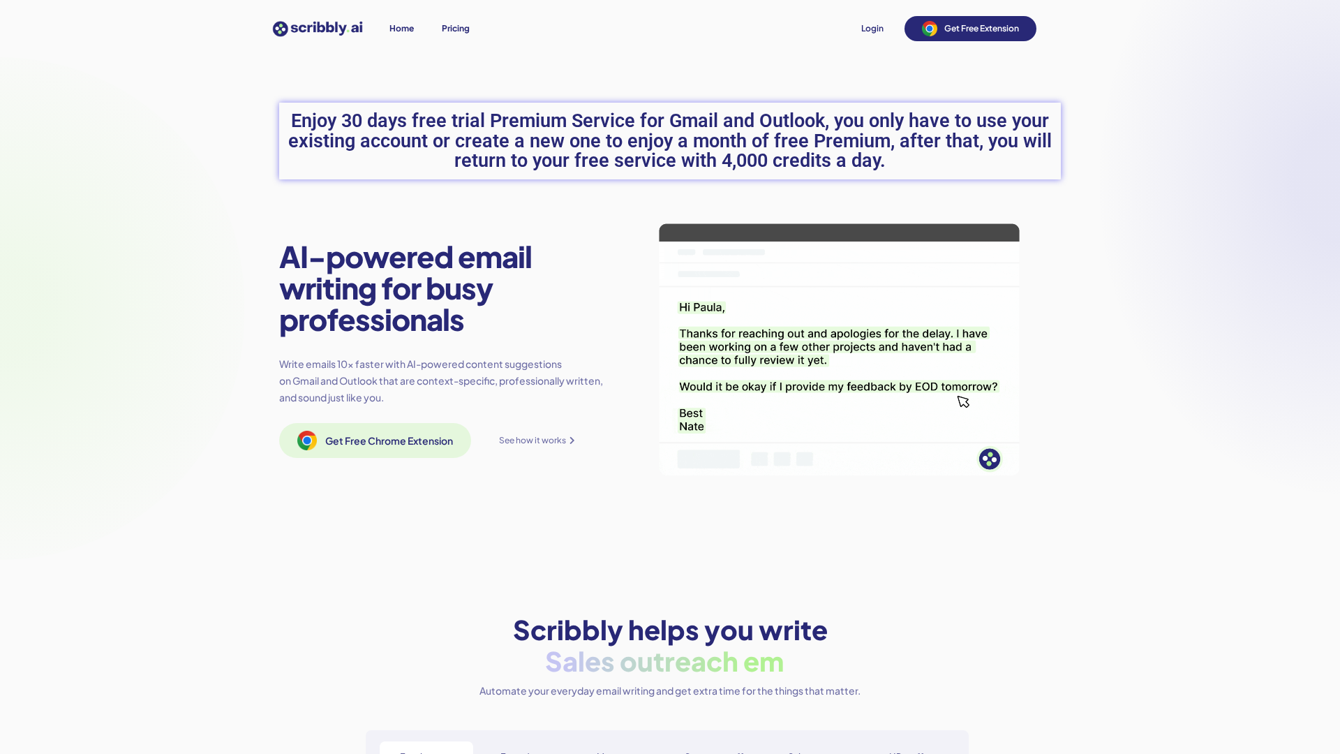 Scribbly is an AI-powered Chrome extension that helps busy professionals write, reply to, and polish emails faster by generating context-aware, tone-adjusted suggestions directly inside Gmail and Outlook. It analyzes the selected email or user-provided context, lets the user choose the reply intention, and produces a draft which can be edited and sent. The product focuses on professional day-to-day communications — sales outreach, client communications, customer support, HR, and internal team coordination — and uses a credits-based freemium model with an optional Premium subscription for unlimited usage. Scribbly states it processes emails temporarily and removes data afterward to protect privacy. (Source: https://www.scribbly.ai/)