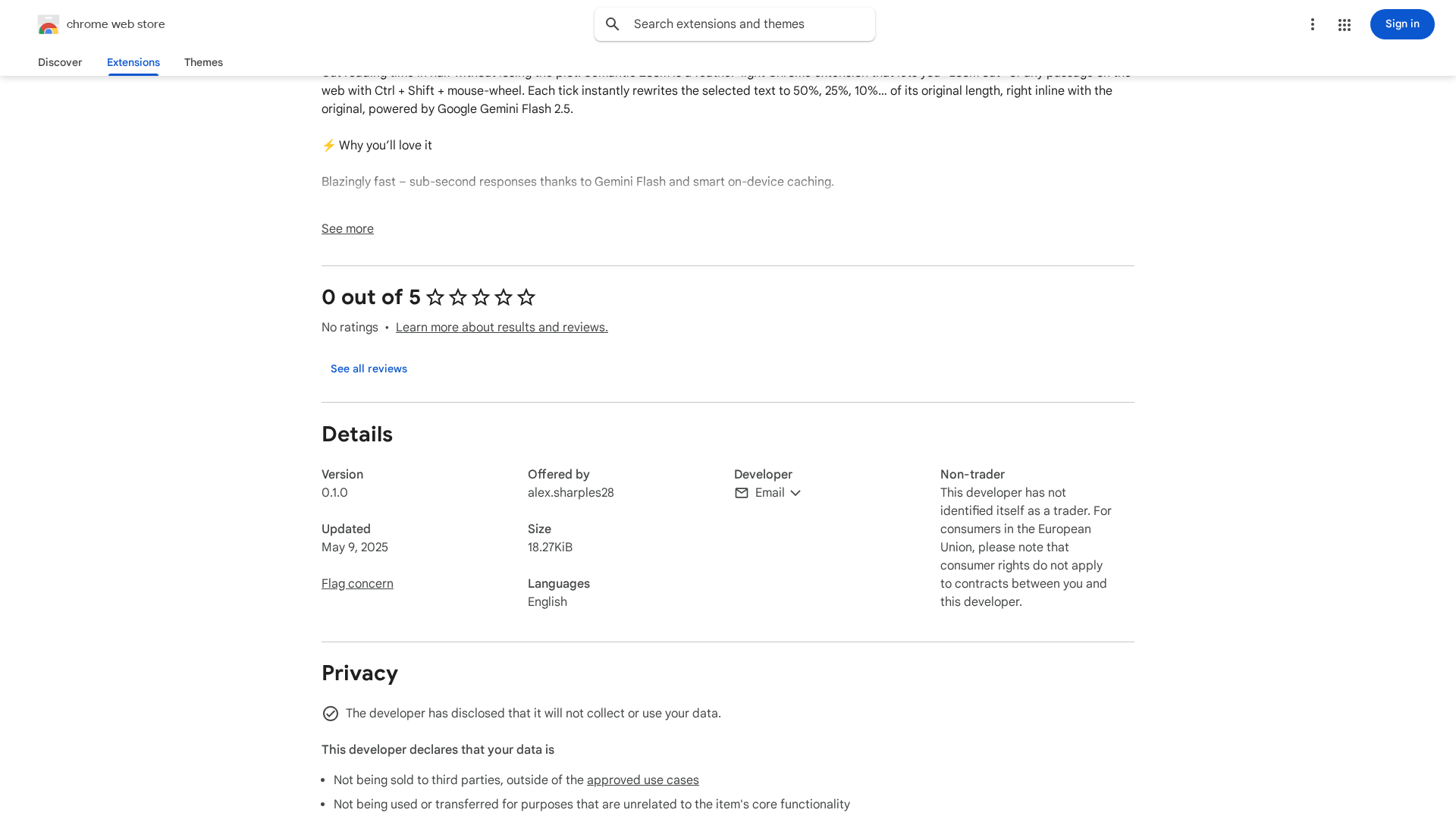 Semantic Zoom is a feather-light Chrome extension that fights information overload by producing fast, in-place AI summaries of highlighted web text. Using the Ctrl+Shift + mouse-wheel gesture, users progressively condense selected passages to 50%, 25%, or 10% of their original length; each “tick” rewrites a concise summary inline alongside the original text. The extension emphasizes sub-second responses (powered by Google Gemini Flash 2.5) and smart on-device caching for speed while remaining ultra-lightweight (under ~20 KB) and not running background tabs. The tool is privacy-forward: the developer states text is sent directly to Google and not logged or stored by the developer. Users supply their own Google AI Studio (Gemini) API key and therefore pay only Google’s usage costs. This model keeps the extension free to install and minimizes developer-side data retention and cost overhead.
