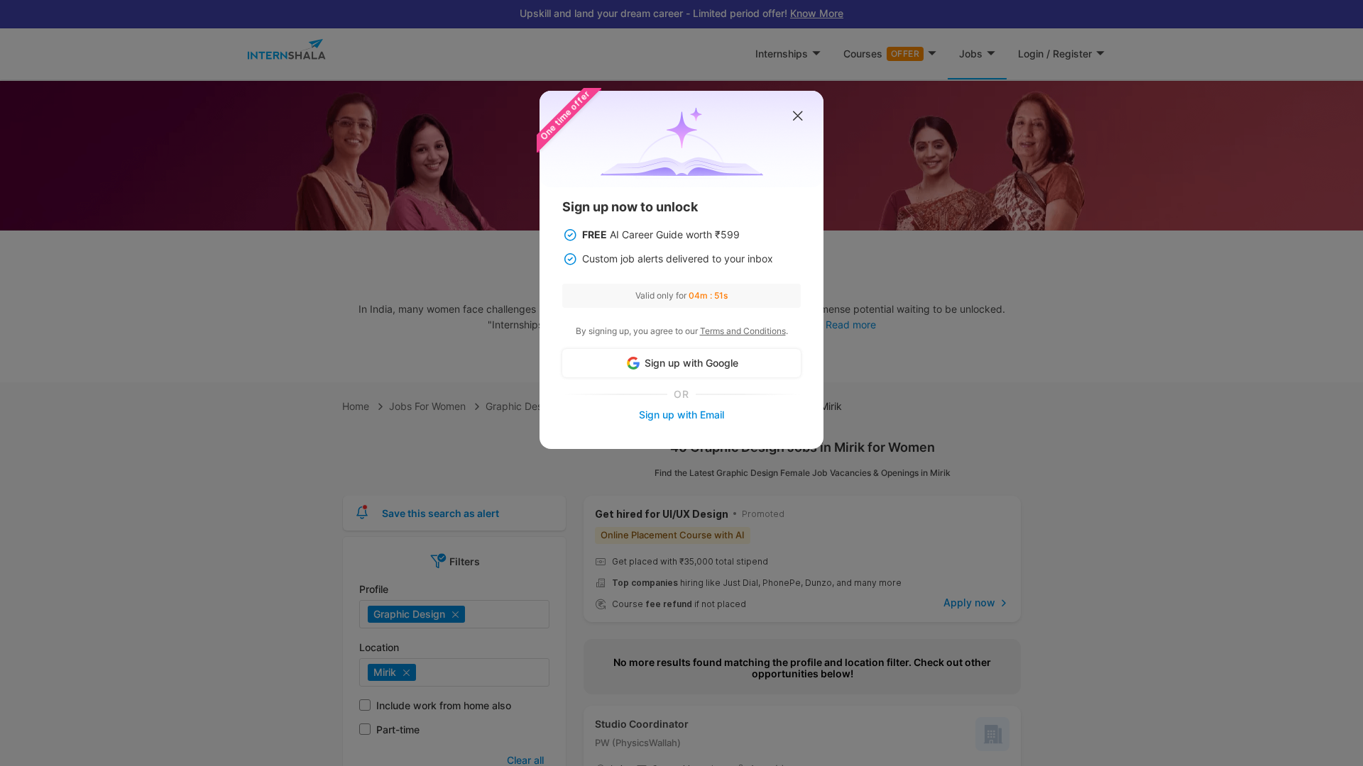 A curated Internshala listing of 40 graphic design jobs for women in Mirik, with roles spanning design, video editing, and motion graphics.