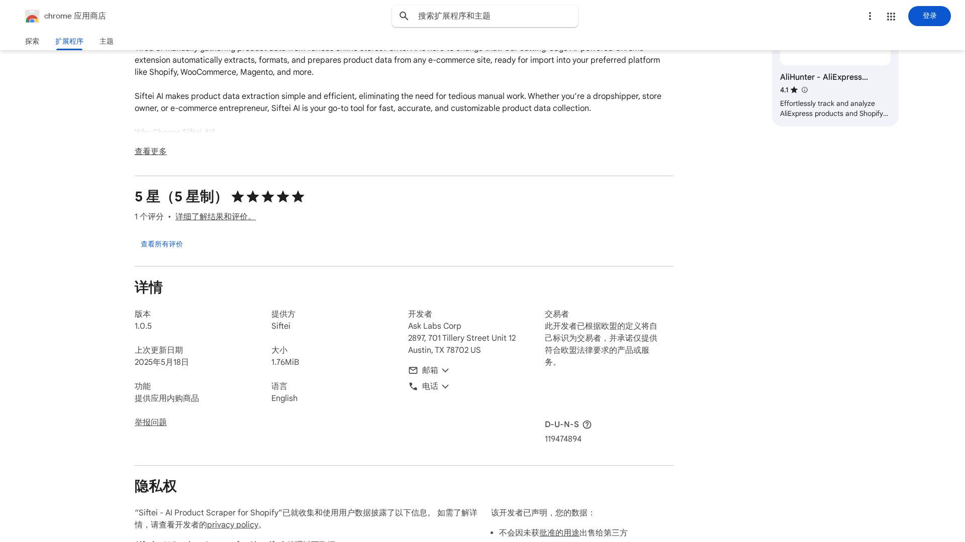 Concise overview of the Siftei AI Product Scraper Chrome extension, derived from the Chrome Web Store page, the official site, and the privacy page. This extension provides AI-powered, one-click data extraction for Shopify and other platforms. It automatically detects essential product attributes such as titles, prices, images, descriptions, specifications, SKUs, variants, and stock levels. It exports data to a Shopify-compatible CSV format and also supports exporting to other supported platforms like WooCommerce, Magento, Wix, and BigCommerce. It includes a Shopify Instant Scraper mode with store detection, collection-based filtering, real-time scraping, AI-driven customization, and CSV mapping aligned with Shopify. The tool supports customizable extraction via templates and instructions to map fields or transform data. It includes content transformation (multi-language translation, reformatting, brand-name normalization) and content generation (SEO-optimized descriptions, product stories, social captions). The UI is no-code and point-and-click, designed for speed and scalability, claimed to handle thousands of products quickly.