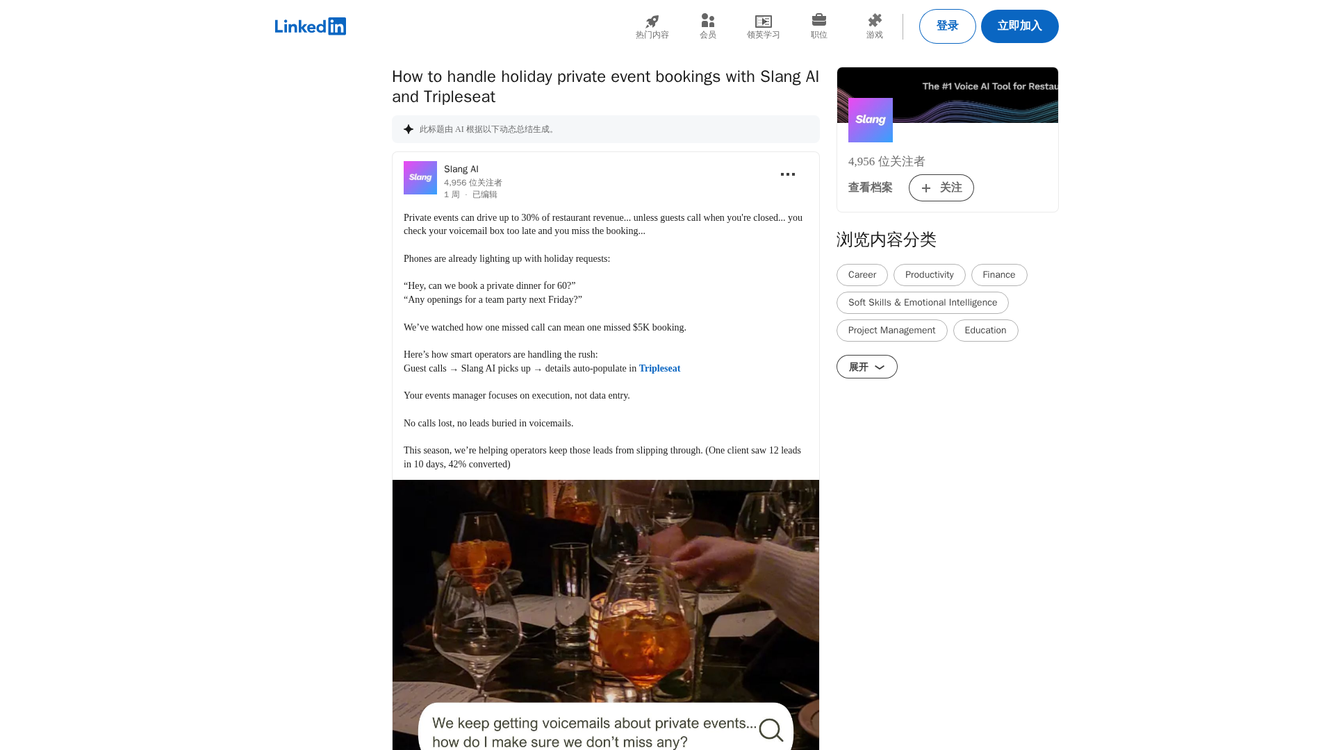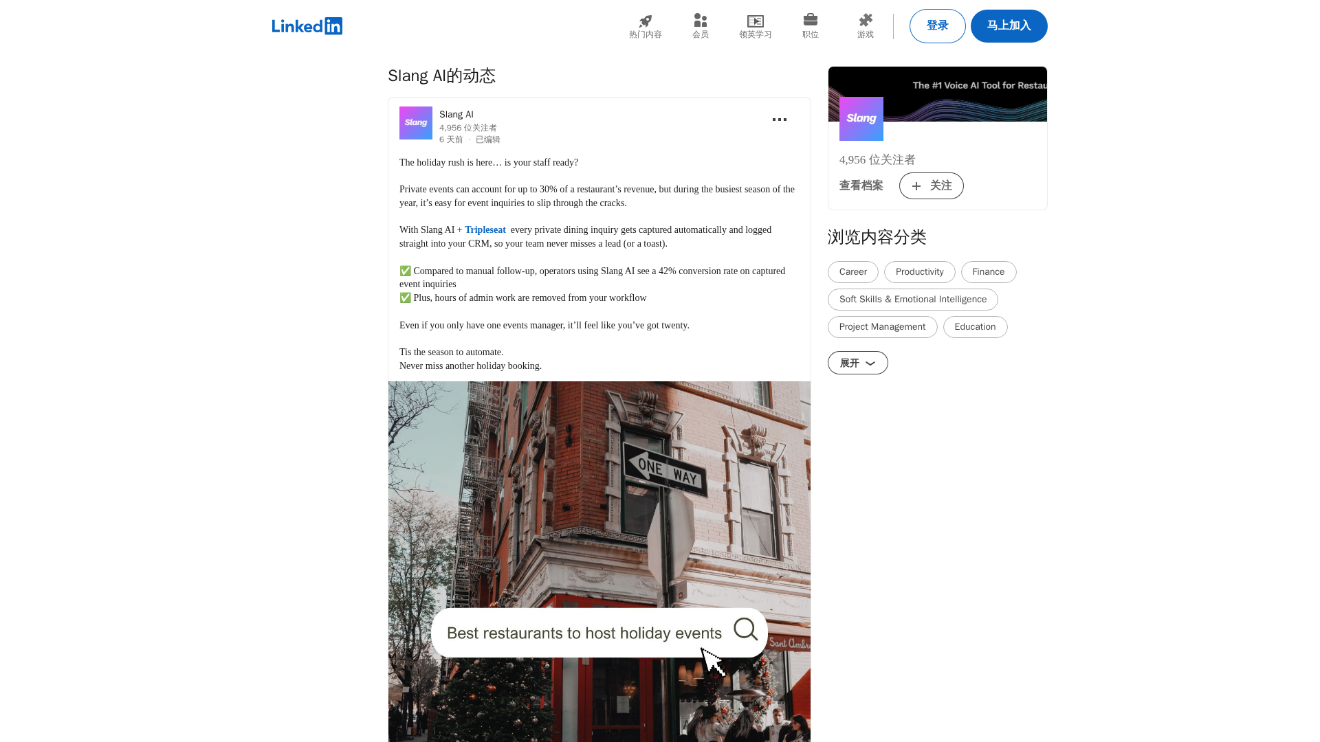 Promotes Slang AI + Tripleseat for automating private-event inquiries during the holidays to boost conversions and reduce admin work.
