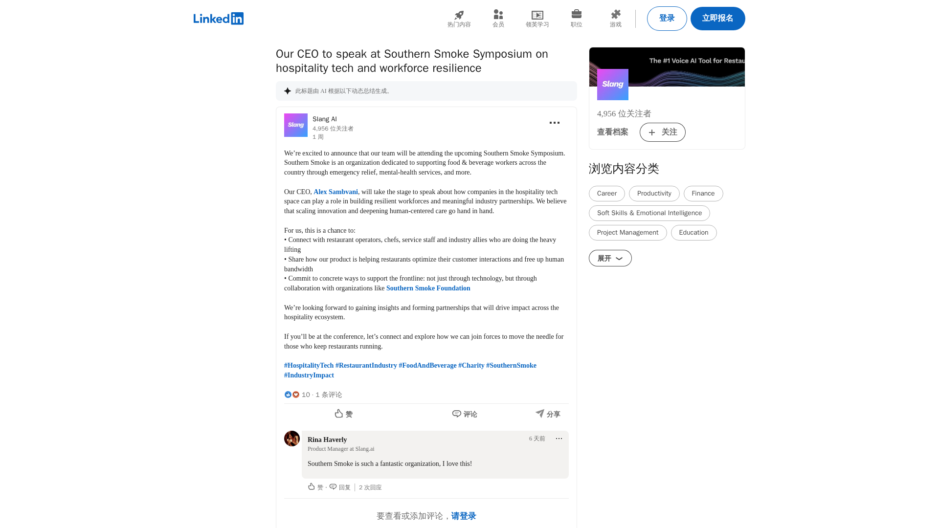 Slang AI to discuss frontline resilience and partnerships in hospitality tech at the Southern Smoke Symposium.