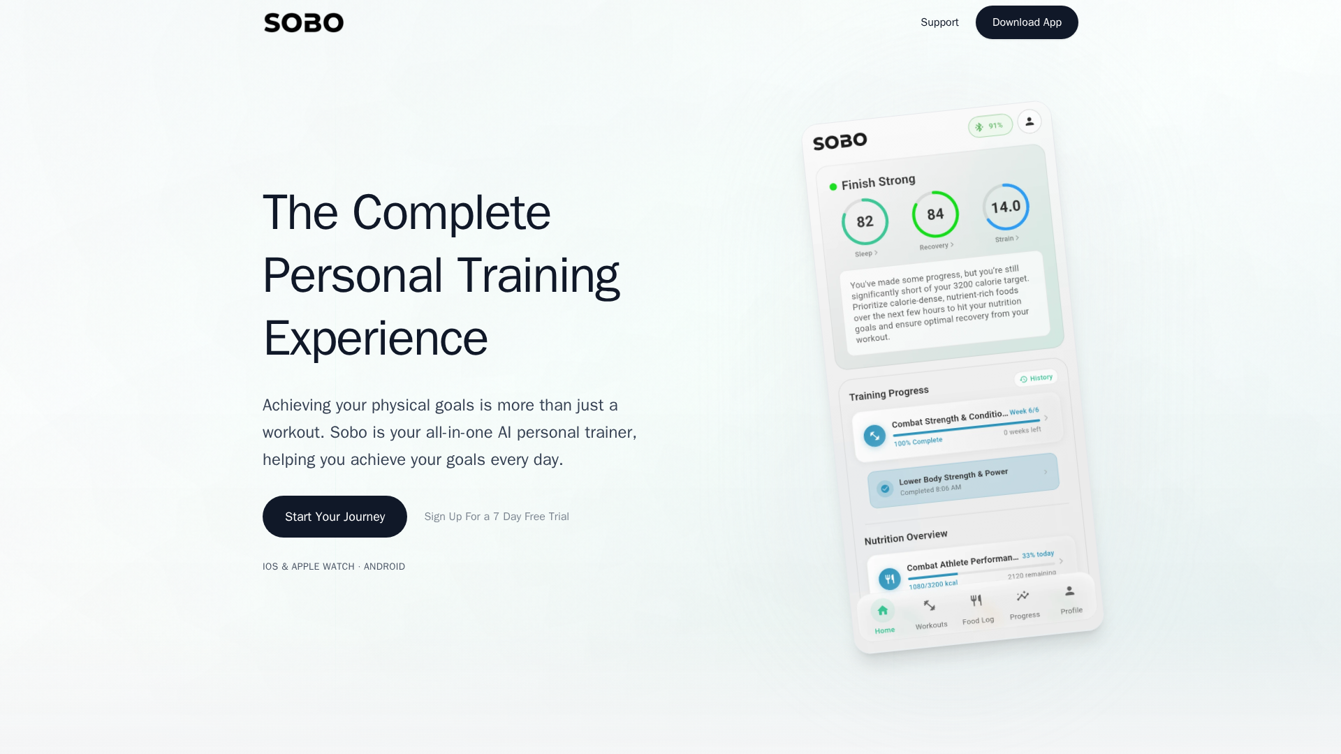 Sobo is an AI personal trainer that personalizes workouts, recovery, and nutrition with 24/7 coaching across mobile and wearables.