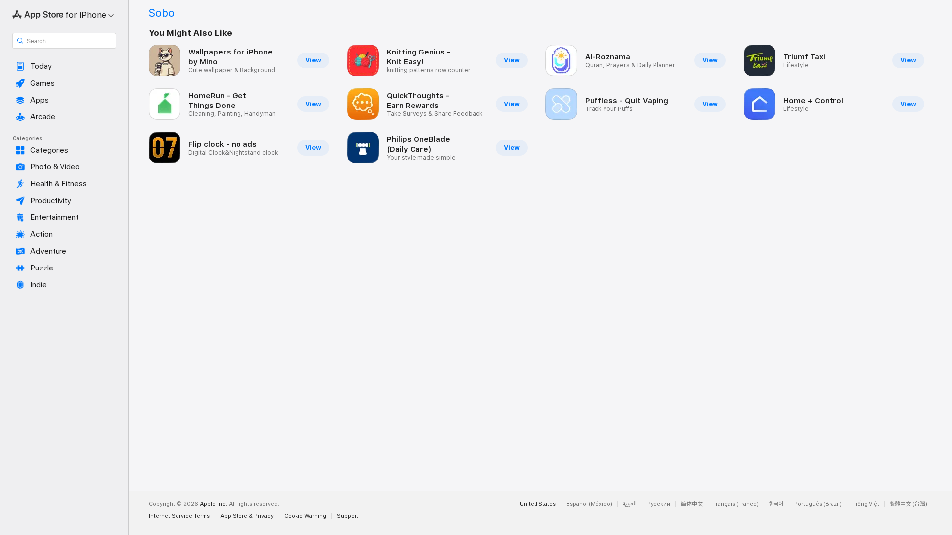A snapshot of Sobo's App Store 'You Might Also Like' suggestions across wallpapers, planning, and home tasks.