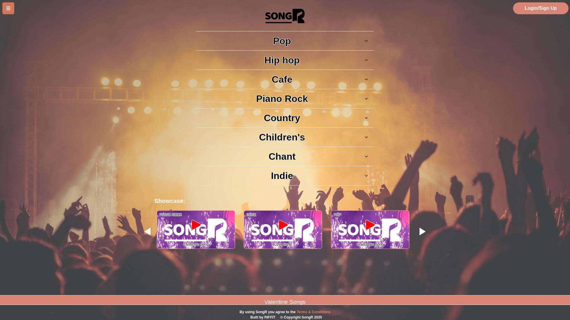 Multiple genre presets (examples shown: Pop, Hip hop, Cafe, Piano Rock, Country, Children’s, Chant, Indie) to shape instrumentation and style.