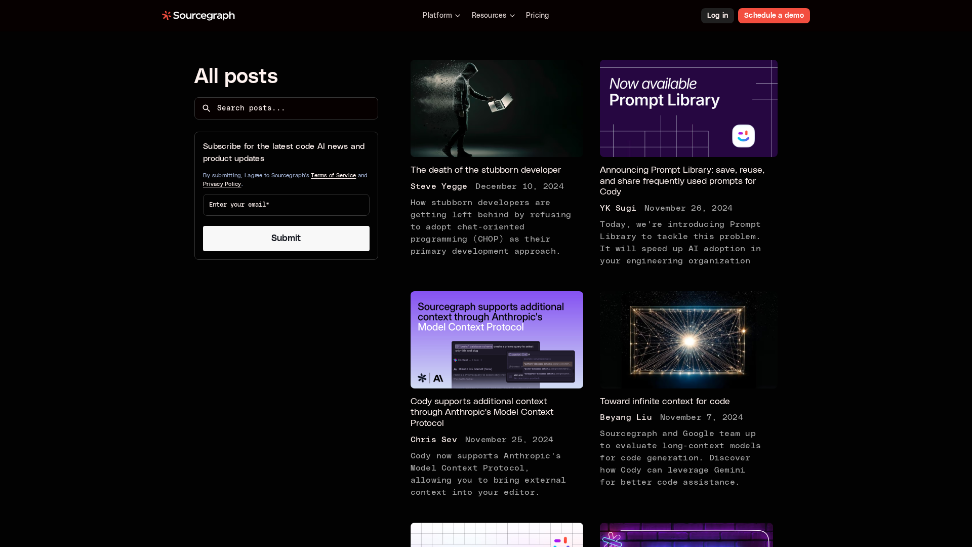 A hub of Cody and CHOP updates, from Prompt Library to long-context models and enterprise ROI.