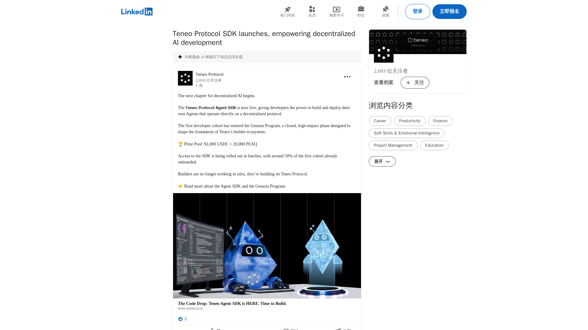 Teneo Protocol launches Agent SDK to enable decentralized AI Agents and kicks off the Genesis Program for ecosystem builders.