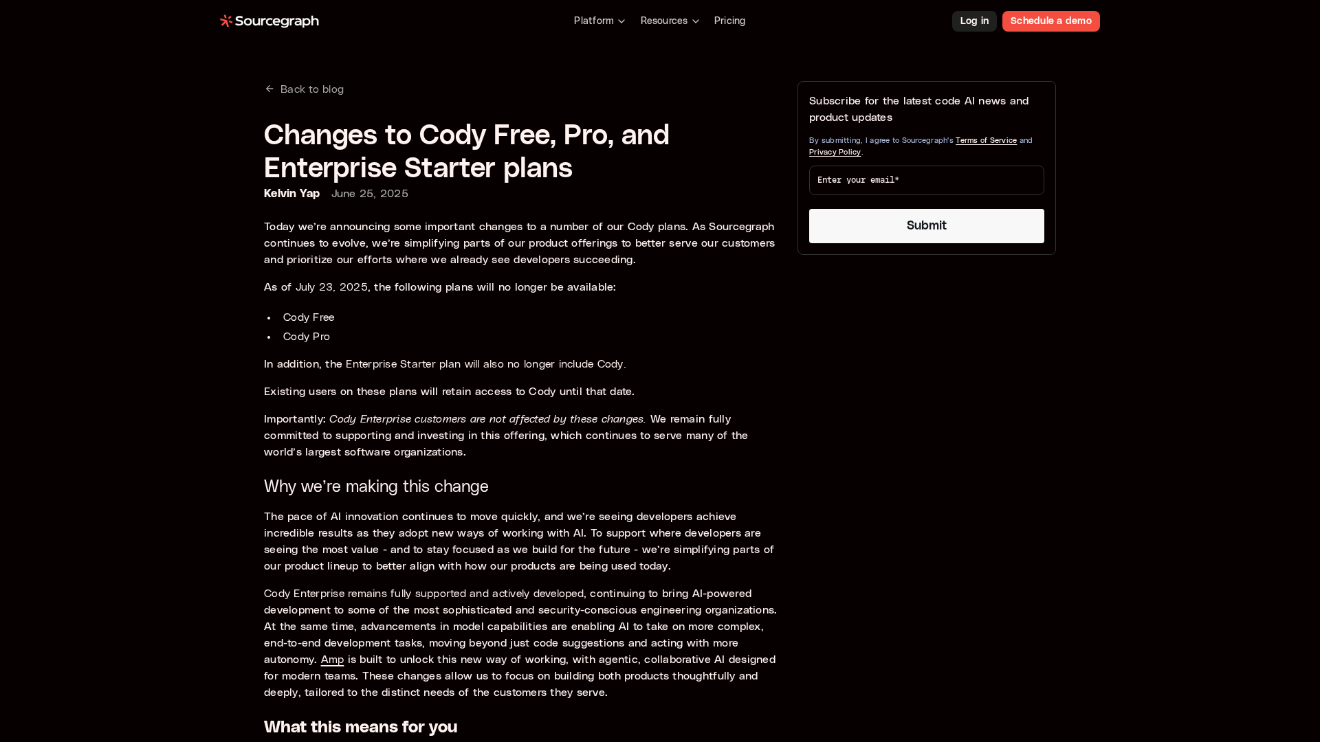 - ✗Cody Free, Cody Pro, and Enterprise Starter sign-ups have been closed (per 2025-06-25 blog post).
