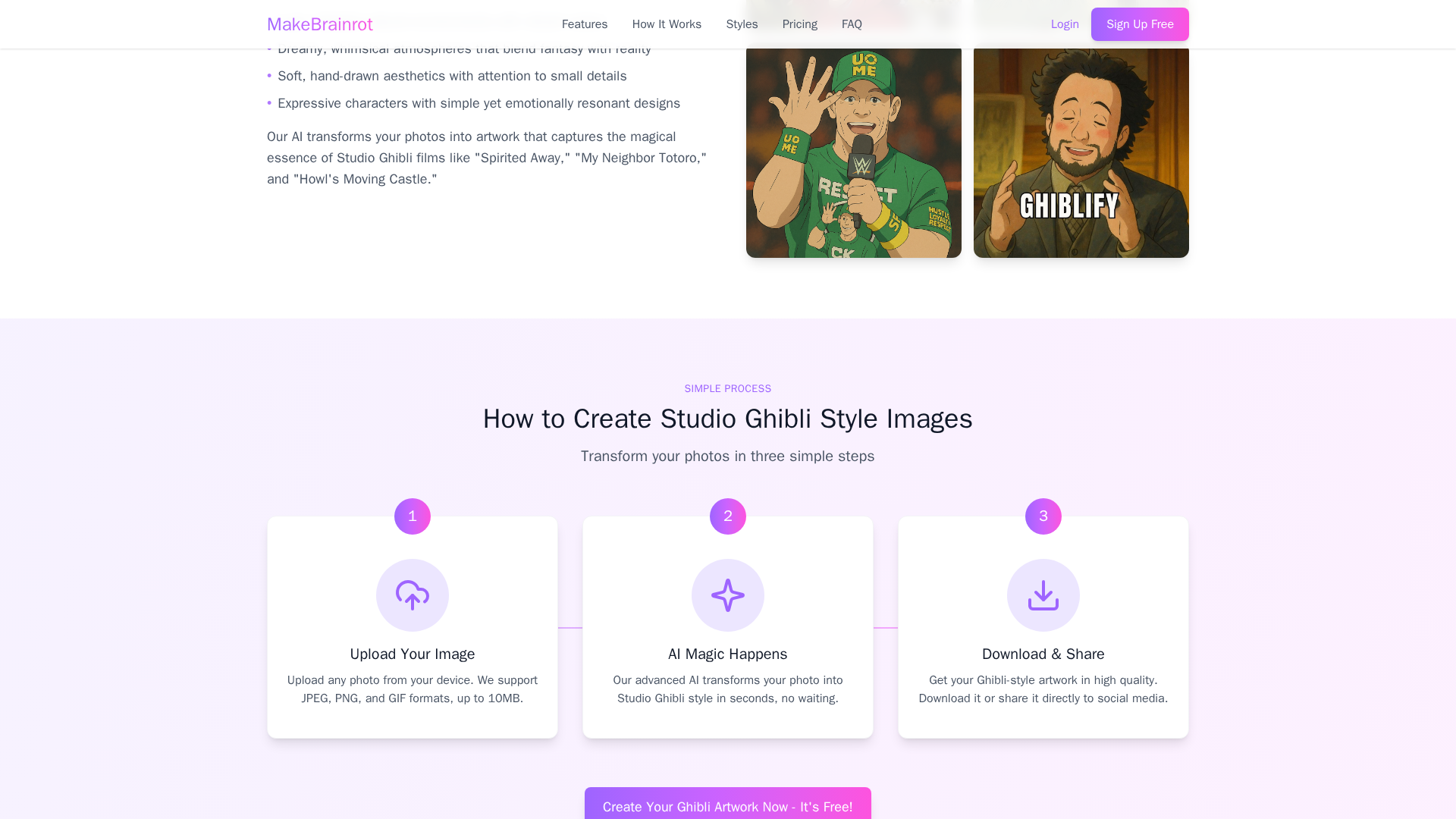 MakeBrainrot is an online tool that converts uploaded photos into Studio Ghibli–style images, delivering dreamy, hand-drawn, lush environments. Powered by an AI trained on a wide range of film-style frames, it can also render other styles such as Pokémon, Cyberpunk, South Park, and Coloring Page. The service uses a credit-based pricing model: each transformation costs 1 credit, with a free 5-credit trial for new users and no ongoing subscription required. Credits do not expire. Outputs are high-resolution images suitable for download, printing, and sharing, and most transformations complete in under 30 seconds. Purchases are processed through third-party payment providers. Ownership: users retain ownership of their original images and the transformed outputs; commercial use of transformed images is allowed. The site notes that outputs are inspired by established styles and do not confer rights to the Studio Ghibli IP. Uploading grants MakeBrainrot a worldwide, non-exclusive, royalty-free license to use or display content to provide and improve the service, with an option to opt out of showcasing. Prohibited uses include illegal content, deepfakes, IP infringement, impersonation, and other violations.