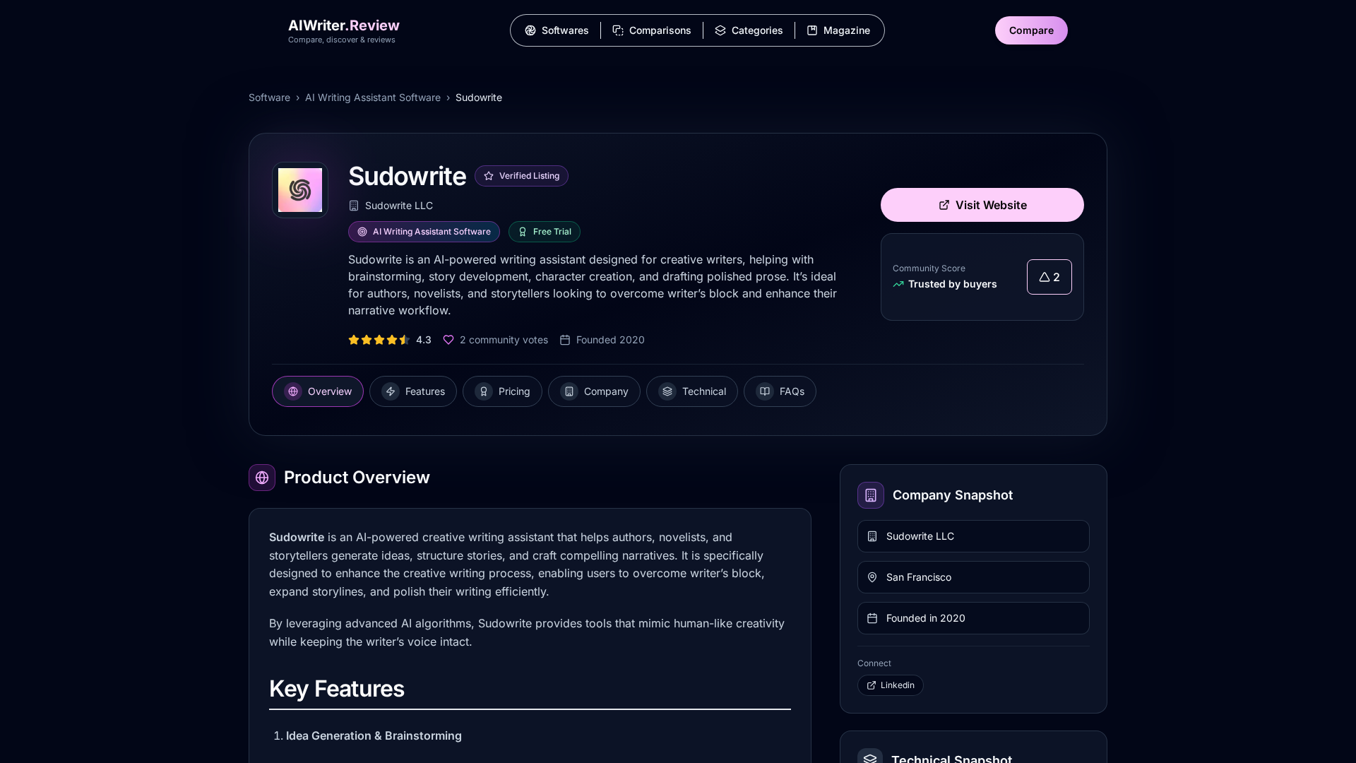 Sudowrite is a web-based AI writing assistant tailored for fiction, offering idea generation, story expansion, character development, and prose polishing.