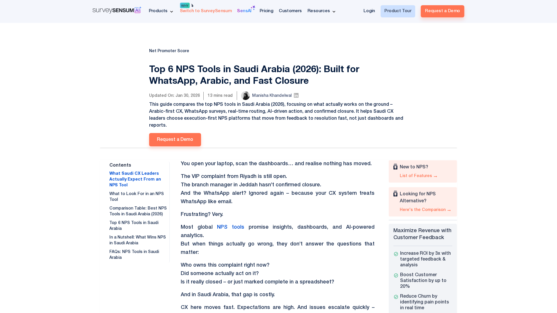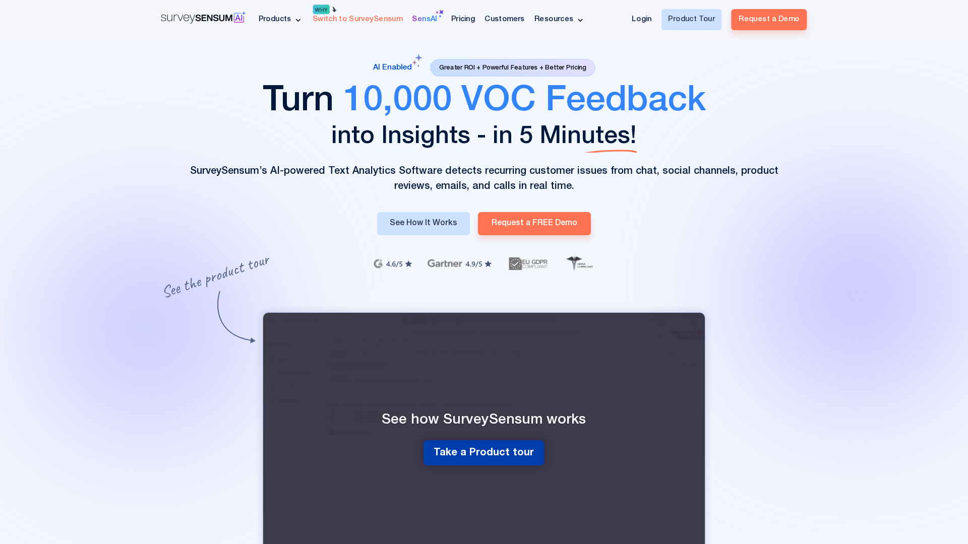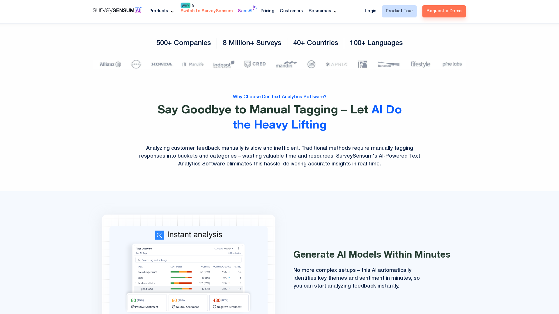 SensAI Conversation Analytics is SurveySensum’s AI-powered text analytics product designed to turn omnichannel voice-of-customer (VOC) feedback into real-time, actionable insights. Core capabilities include automated tagging (AI-generated tags with an option to manually tag and train models based on user tagging behavior), sentiment analysis and category/theme detection, real-time insights and trend analysis, rapid AI model creation (models can be generated in minutes), and smart summaries/insight reports. The product supports ad-hoc queries as well as unlimited AI queries on higher plans. It ingests NPS/open-text surveys, product reviews, social media mentions, chat transcripts, emails, and bulk emails. Integrations include HubSpot, Slack, Freshdesk, Salesforce (Starter plan), SFTP, and Open APIs, all positioned within SurveySensum’s broader VoC/CX suite (NPS/CSAT/CES/SensAI features). Security claims cover PII masking, SOC 2 and ISO certifications, GDPR and HIPAA compliance, hosting-in-your-country options, and DPA availability. The page notes marketing claims of up to 99% accuracy. Pricing appears on the pricing page with subscription and usage-based models and example plans (Starter CX, Self-Driven CX, Managed CX, Custom/Talk to Sales) plus optional implementation support ($50/hour) and CX consultations ($100/session).
