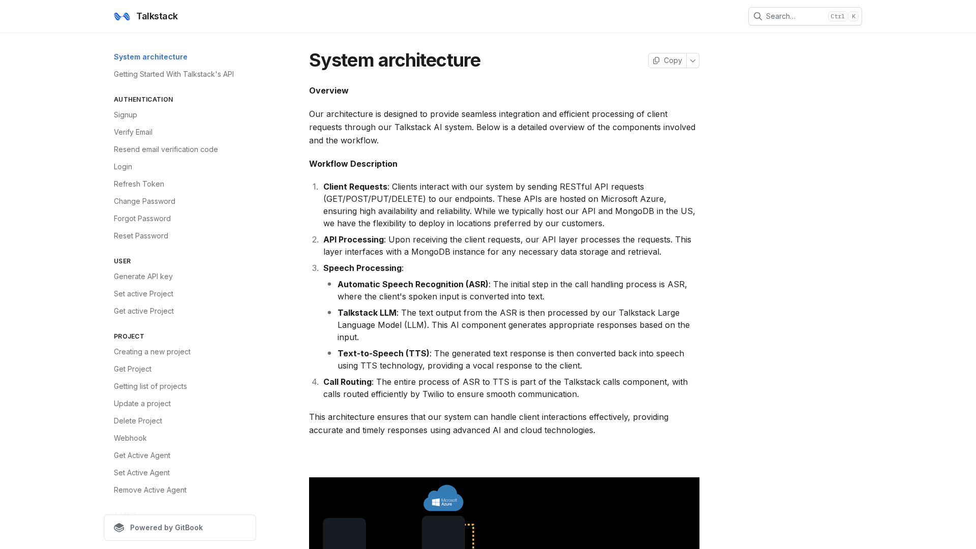 A concise overview of Talkstack's architecture, from API handling to ASR, LLM, and TTS with Twilio-powered call routing.