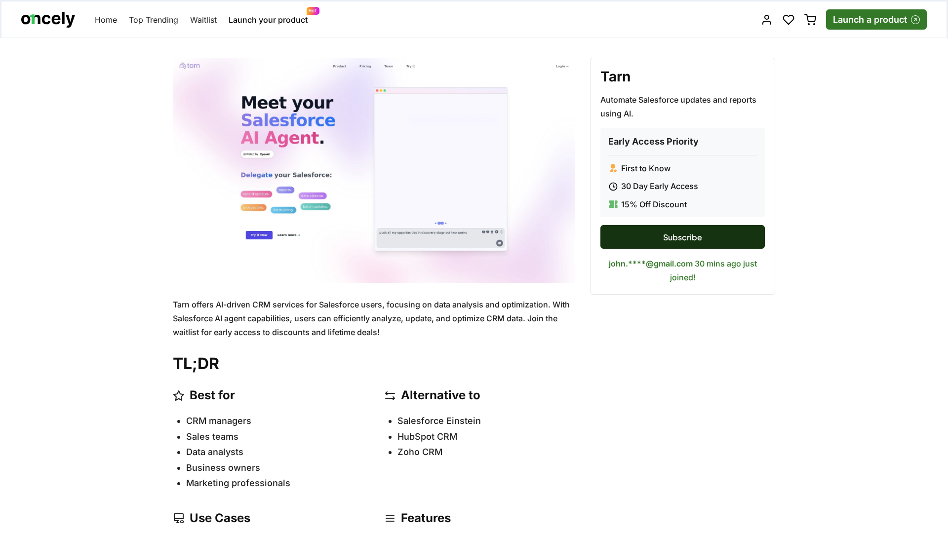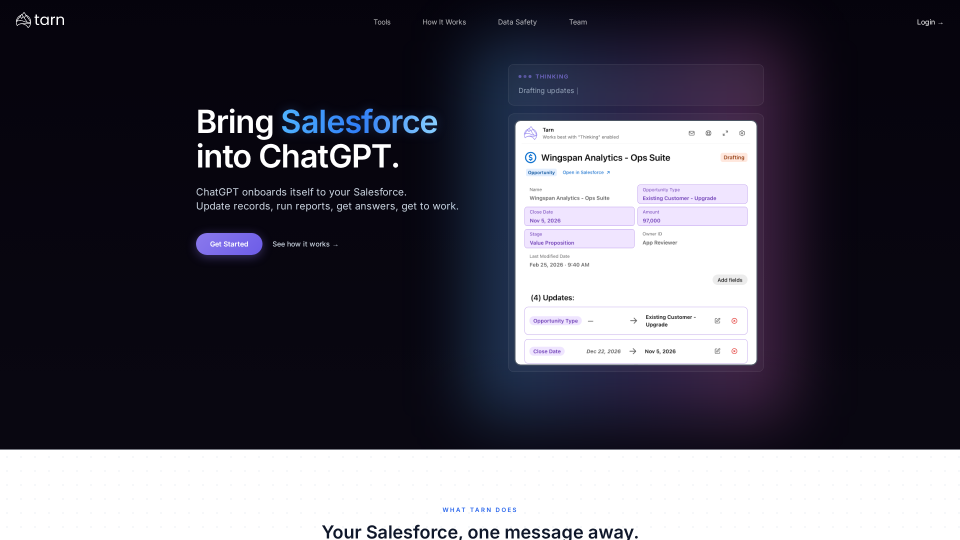 Tarn connects Salesforce data to ChatGPT to power AI-driven CRM conversations.