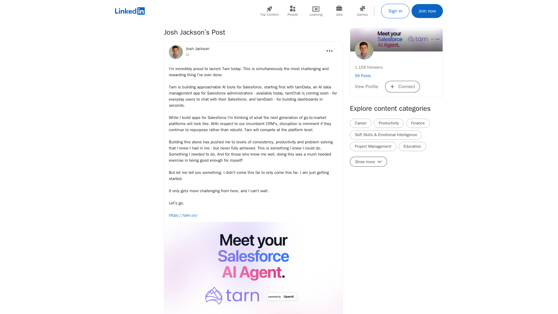 Josh Jackson unveils Tarn, a Salesforce AI agent starting with TarnData, with TarnChat and TarnDash on the horizon.