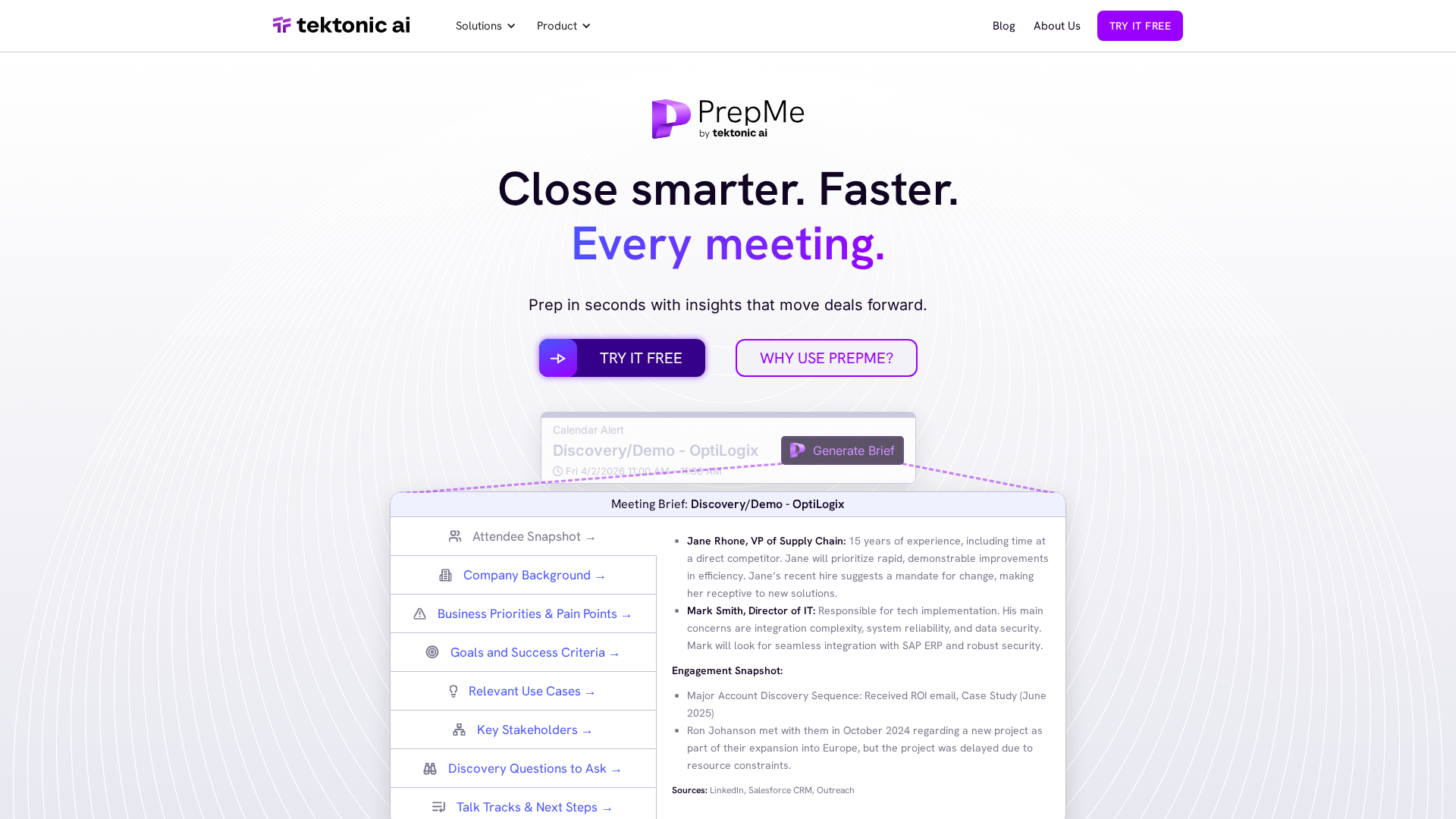 - ✓Real-time AI meeting briefs (PrepMe) that integrate into reps' workflows