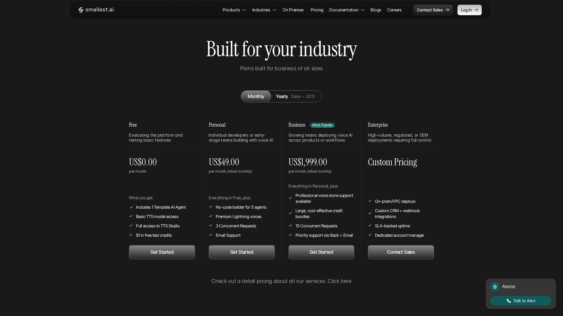 Free: 0 USD/month — 1 Template AI Agent, basic TTS access, full TTS Studio access, $1 in test credits (for evaluation).