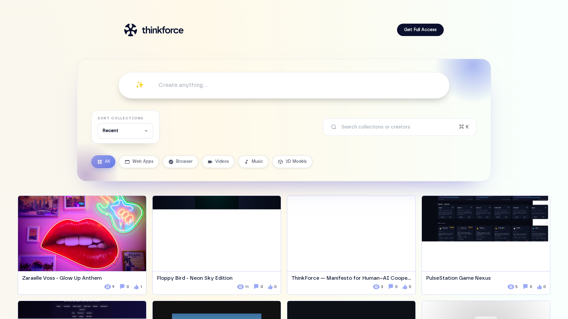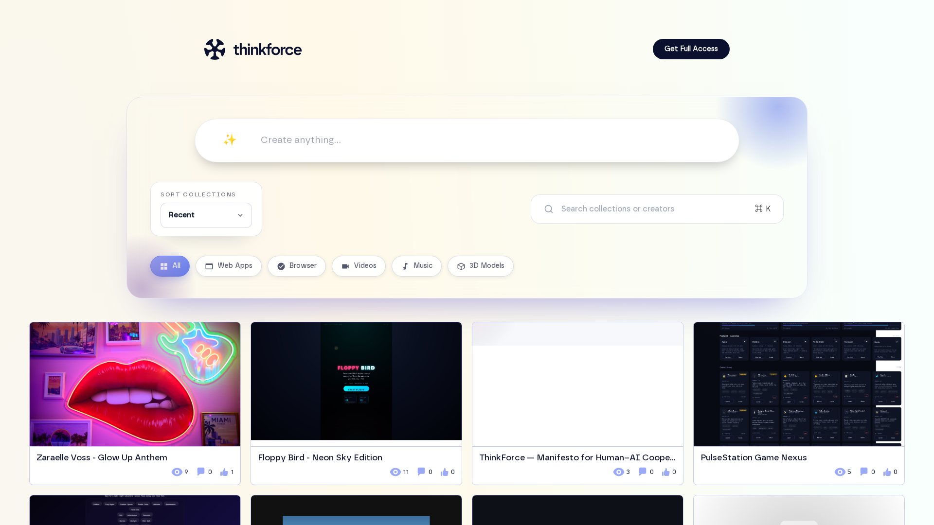 ThinkForce positions itself as an all-in-one creative and collaboration platform that combines a discovery hub of AI-driven tools, curated collections, and real‑time creation workflows. Users can browse and use assets across media types (web apps, videos, 3D models, sprites, sandboxes) and train "AI minds" by feeding prompts and documents. The product emphasizes rapid prototyping, plugins and Zapier integrations, a community-driven catalog (Popular/Most Viewed/Recent), and a pathway to premium/full-access membership. Several expected pages (features, pricing) returned limited or no public content during extraction; some content differs across domains (app.thinkforce.ai, www.thinkforce.ai, thinkforceai.com), so parts of the offering may be in different properties or behind gated access.