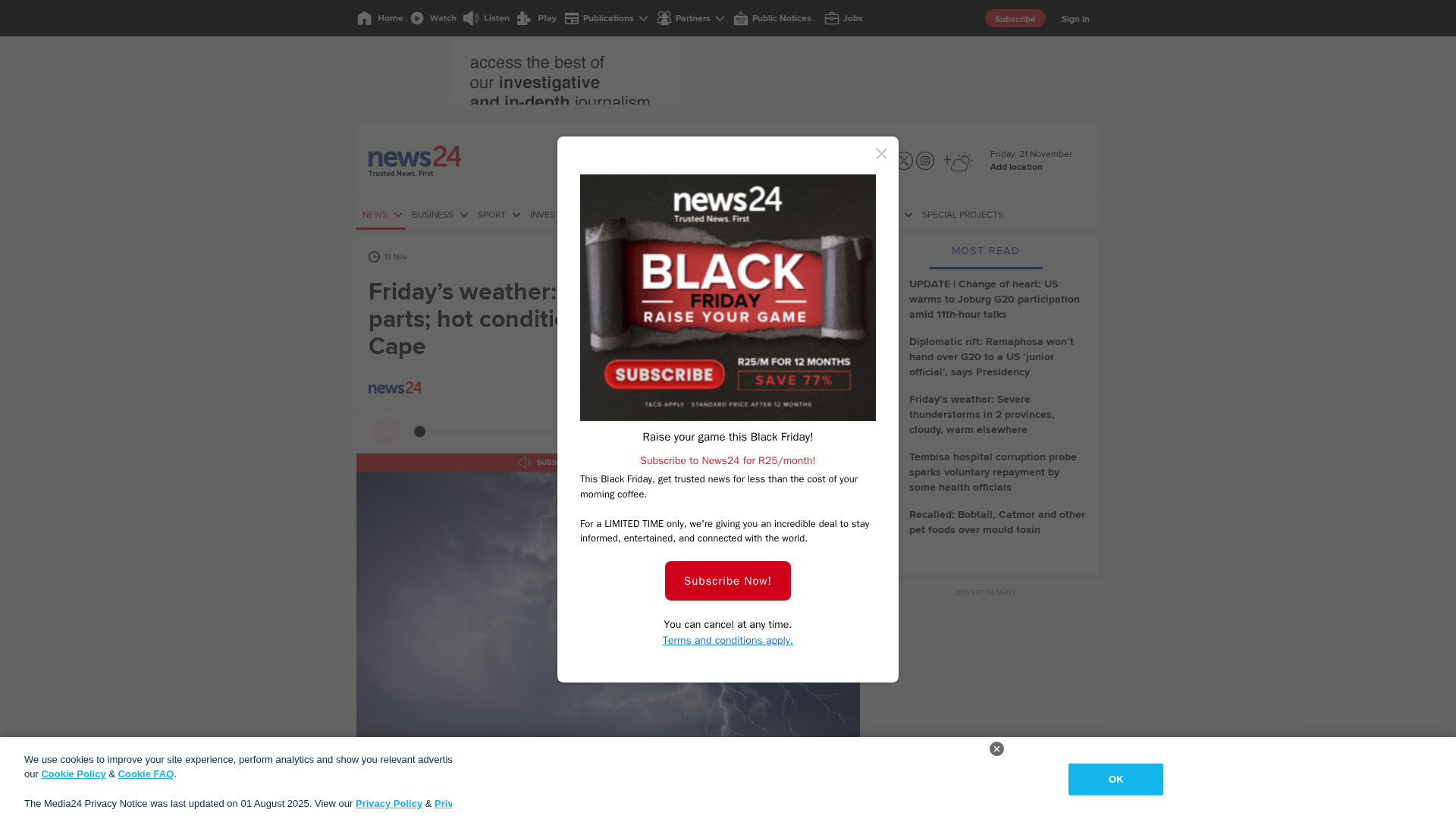 A Friday forecast of widespread thundershowers across SA, with Western Cape hot conditions and weekend warnings in place.