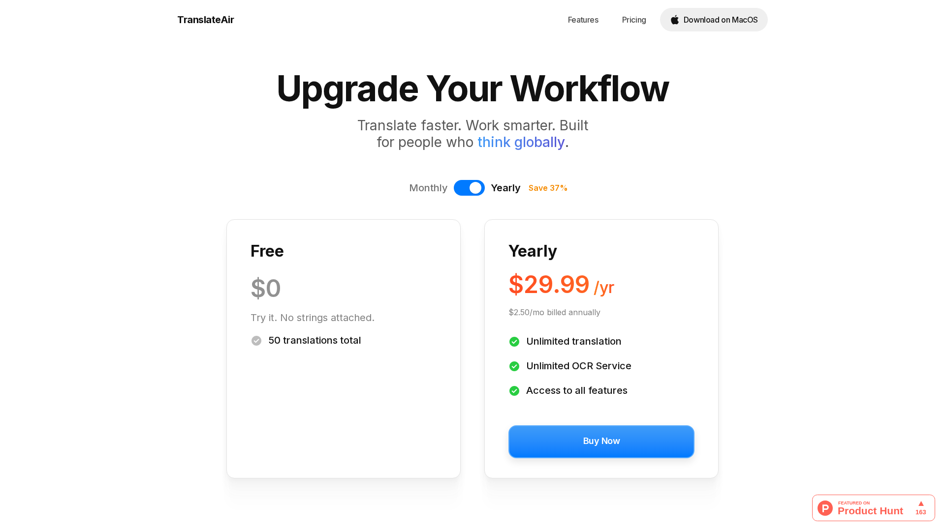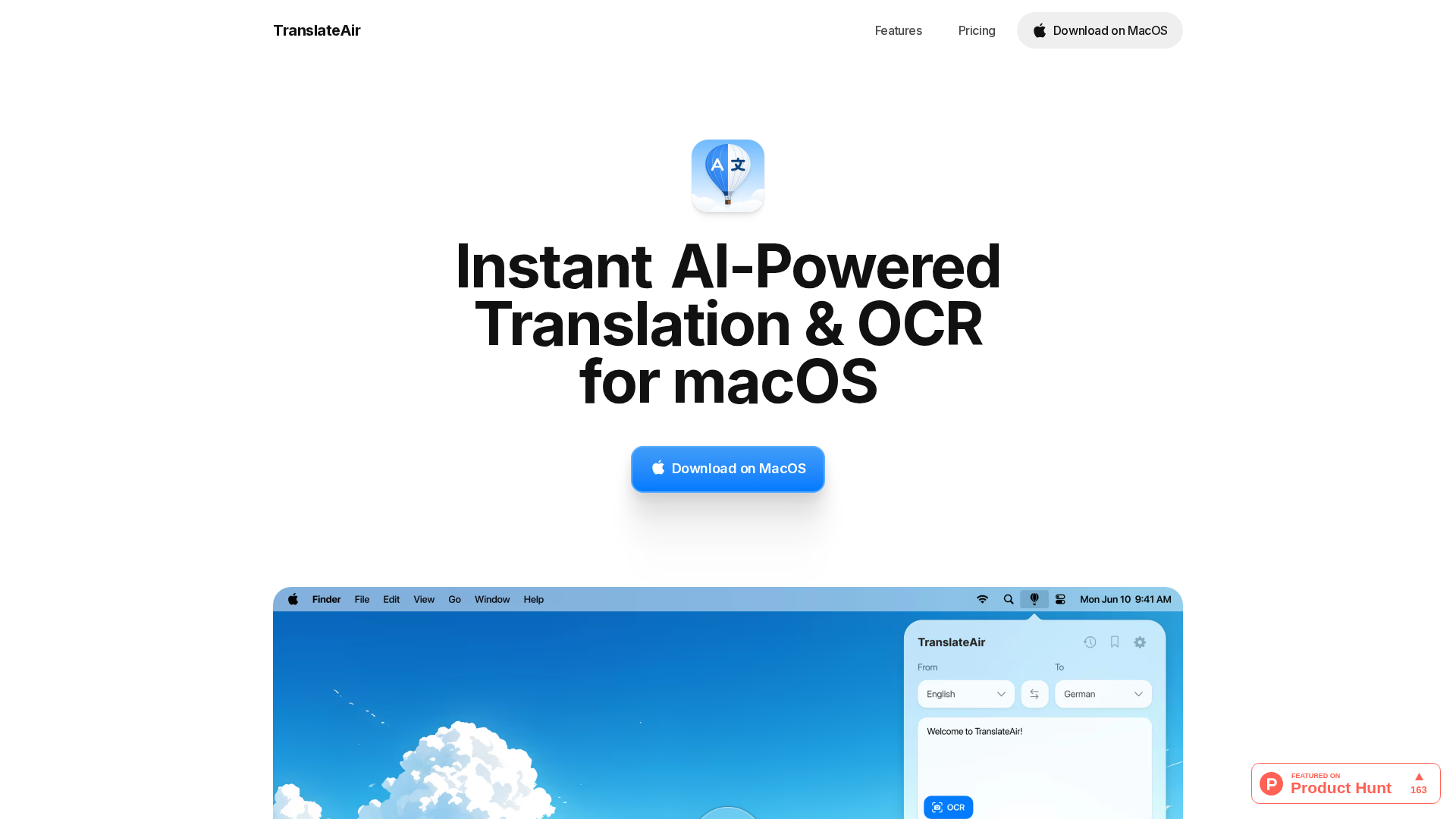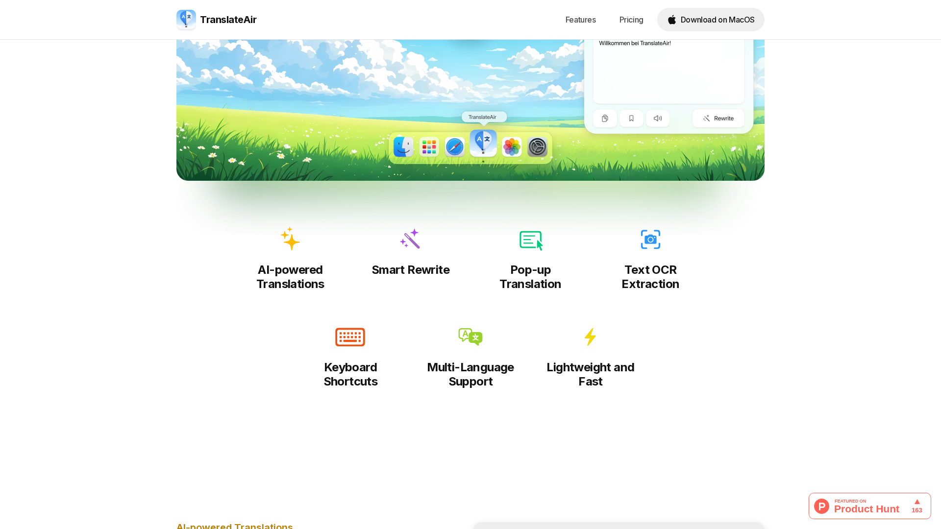AI-powered macOS tool delivering instant translations and OCR across 100+ languages with a floating bar and customizable shortcuts.