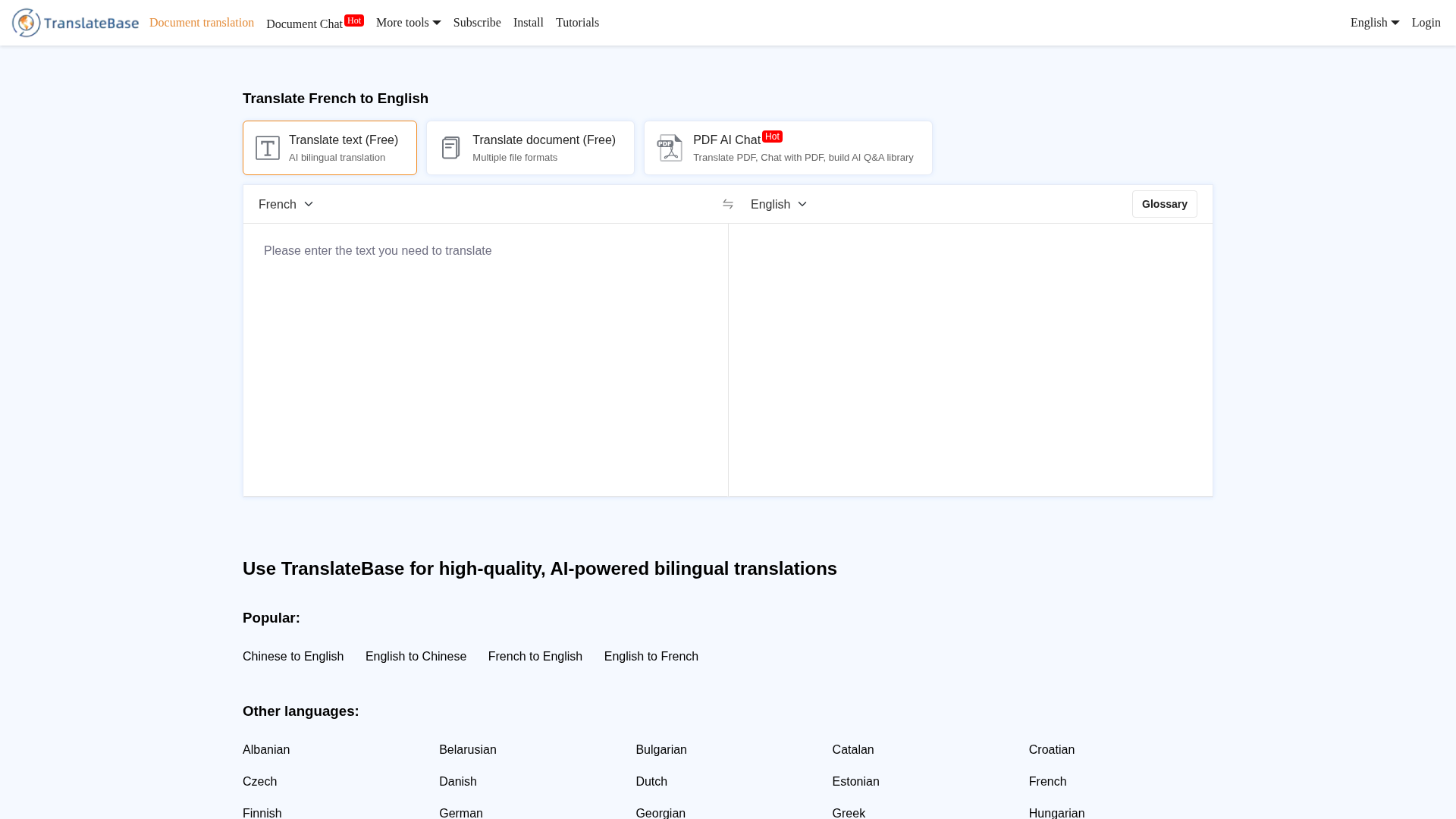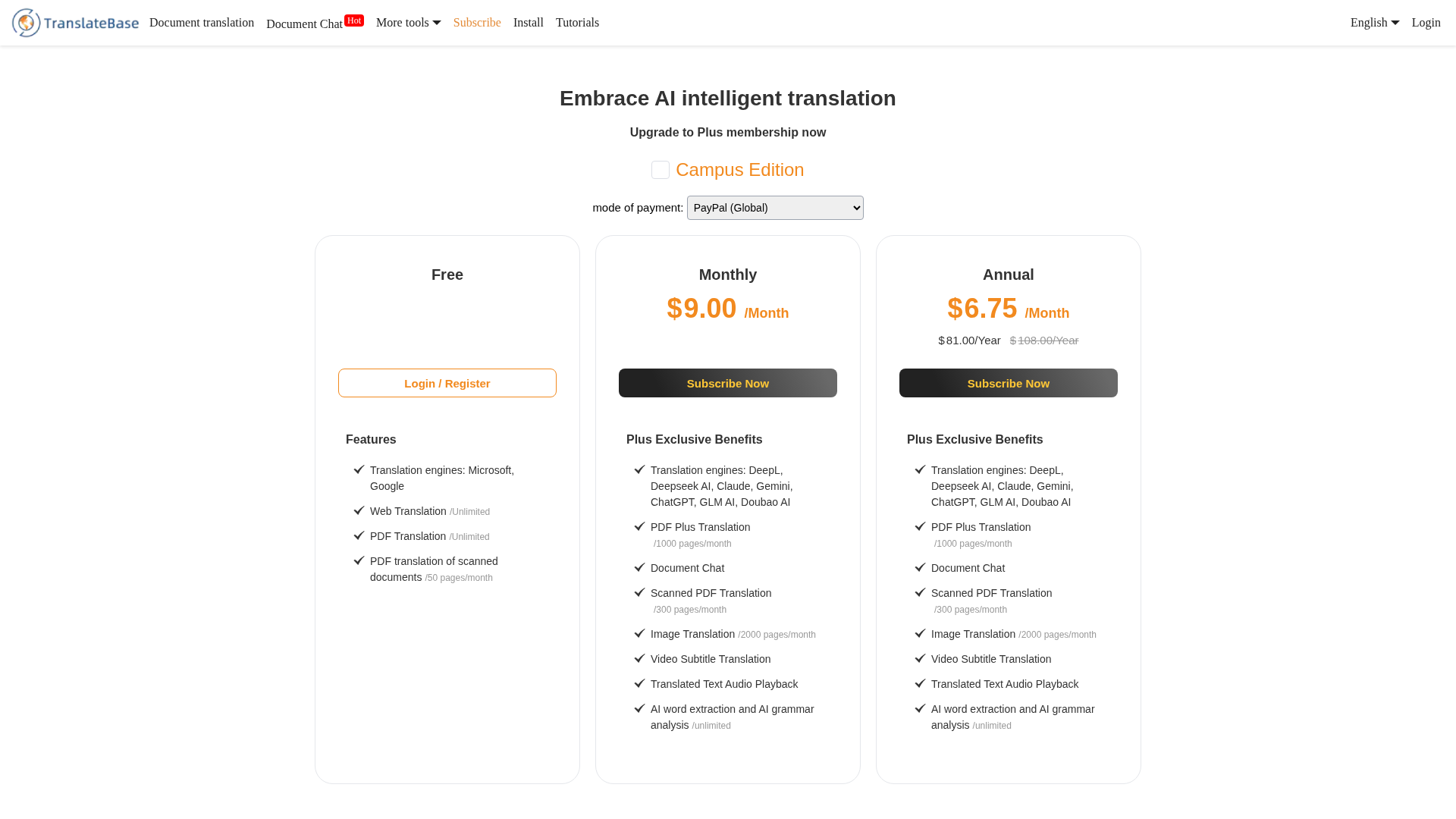 TranslateBase is an AI-driven, multi-engine translation platform offering text, PDF, webpage, image, subtitle/video, and OCR-based scanned-PDF translation. The service emphasizes free basic access and a Plus subscription that unlocks higher quotas and advanced features. It supports 100+ languages and provides a side-by-side bilingual view and engine comparisons to help users assess translation quality. Key capabilities include text translation with multi-engine side-by-side outputs, document translation with layout-preserving bilingual results, OCR-based translation for scanned PDFs, and a PDF estimate tool that returns an instant price and a single-export option. It also offers Document Chat / PDF AI Q&A to turn PDFs into a searchable knowledge base, image translation with text recognition and downloadable translated images, and real-time video subtitle translation with audio playback. Learning aids such as AI word extraction, grammar analysis, pronunciation/audio playback, and vocabulary collection are included, along with a browser plugin (and mobile options) to enable richer in-browser translation and hover/one-click webpage translation. Supported engines include ChatGPT, DeepL, Microsoft, Google, DeepSeek AI, Claude, Gemini, GLM AI, and Doubao AI, with availability depending on plan.