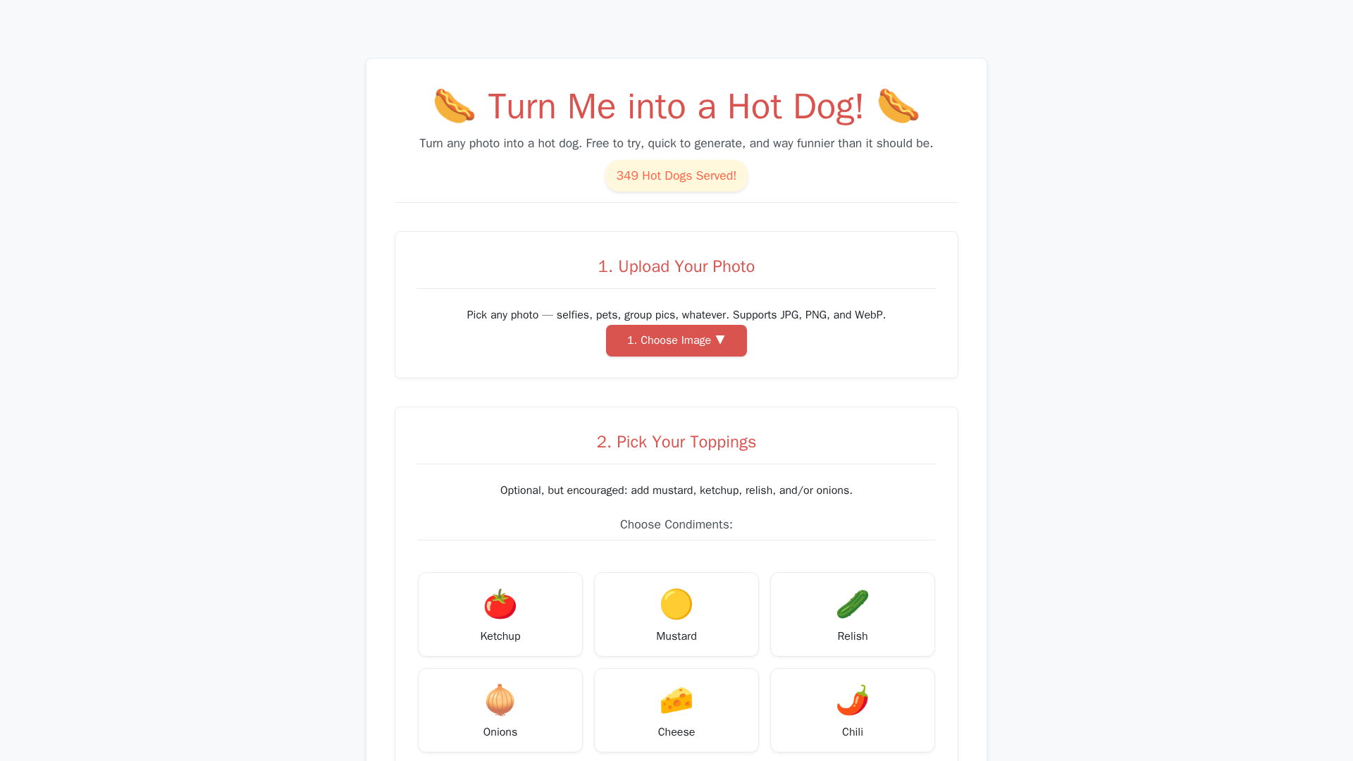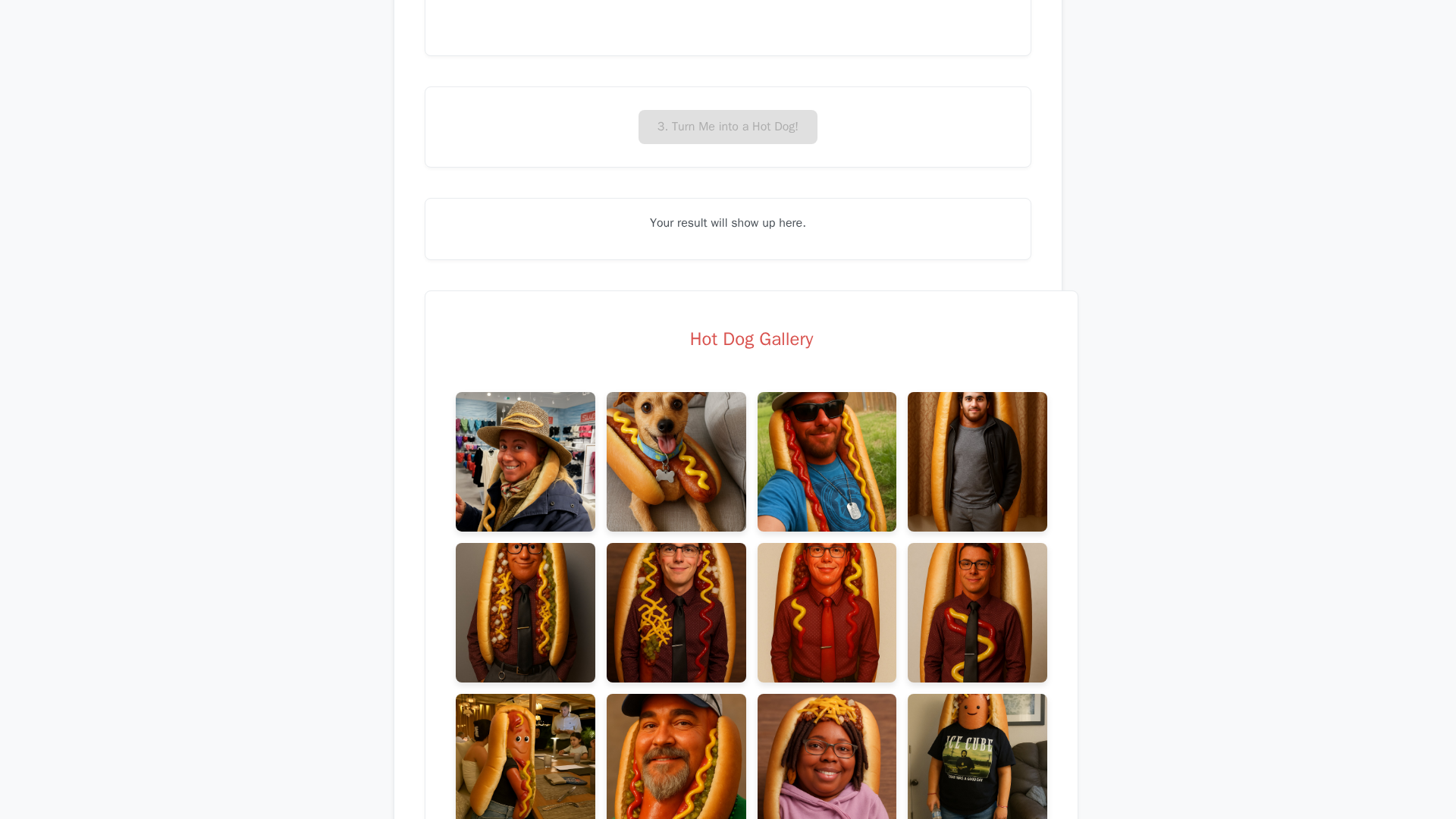 Transforms uploaded photos into hot‑dog themed images using AI.