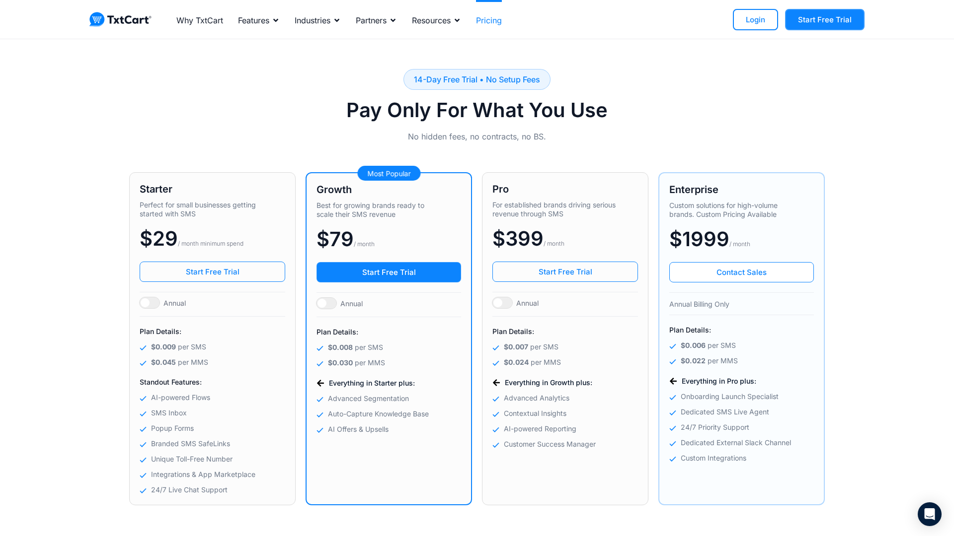 - ✓Transparent pricing with per-SMS/MMS overage rates