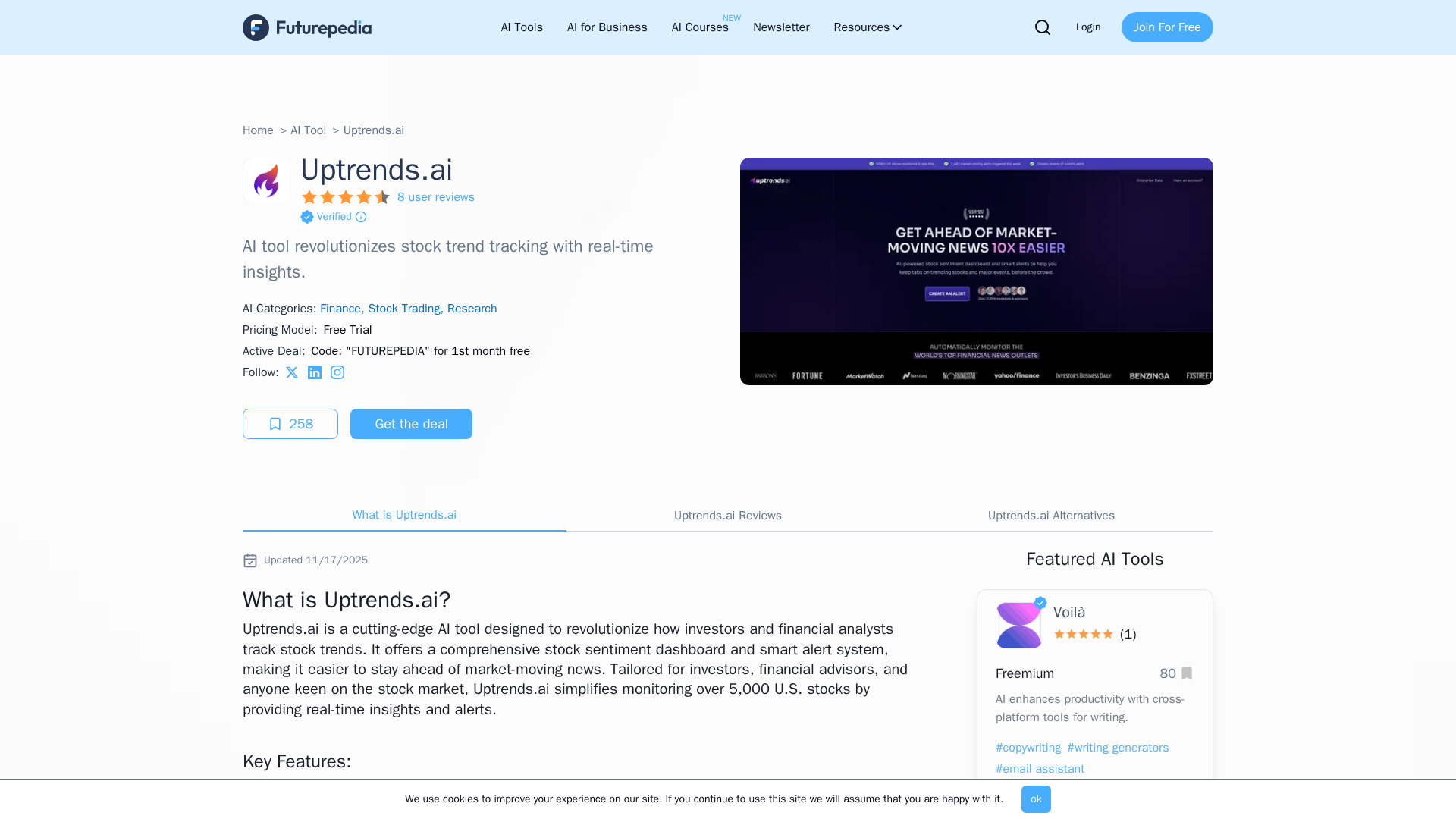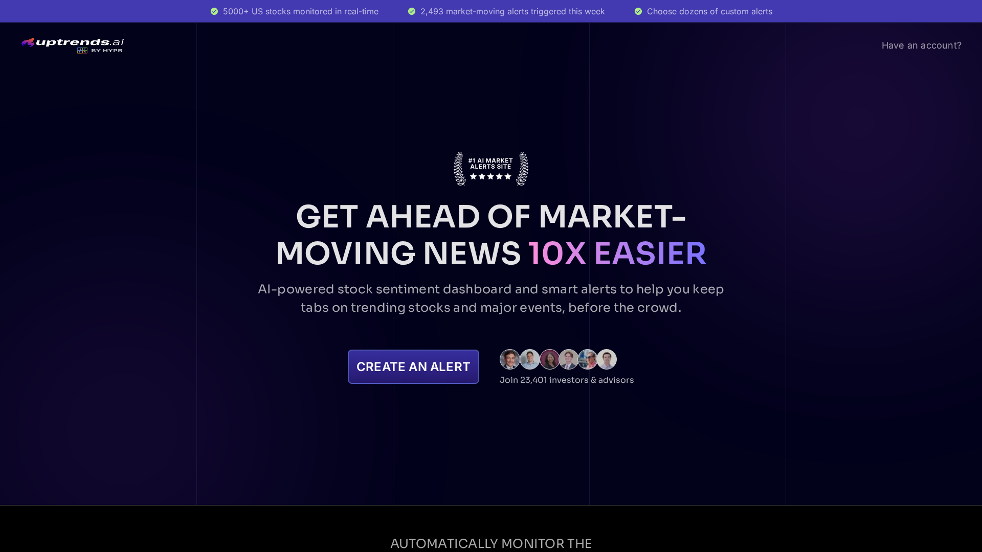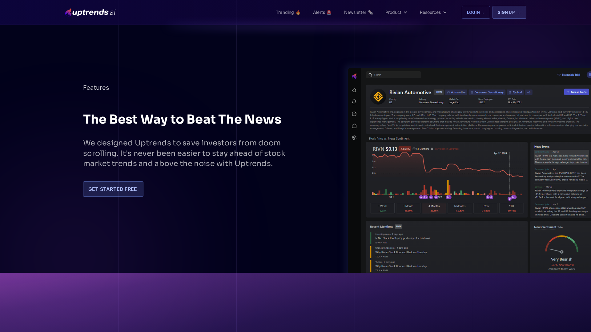 Uptrends.ai is a stock-market news monitoring platform that tracks thousands of sources to monitor 5,000+ US stocks in real time. It uses AI to surface trending stocks, measure news sentiment, generate concise event summaries, and deliver customizable, real-time alerts across many event types (earnings, FDA approvals, mergers, lawsuits, price moves and more). The product offers a Trending Stocks leaderboard, sentiment-over-time and price-vs-sentiment visualizations, watchlists, and an Alerts Feed to help users discover market-moving events quickly. It positions itself as a time-saver for retail traders and portfolio managers by turning noisy online chatter into actionable signals. (Source: homepage, features, pricing pages)